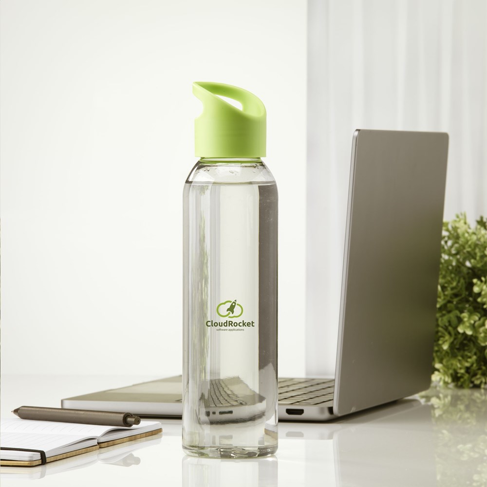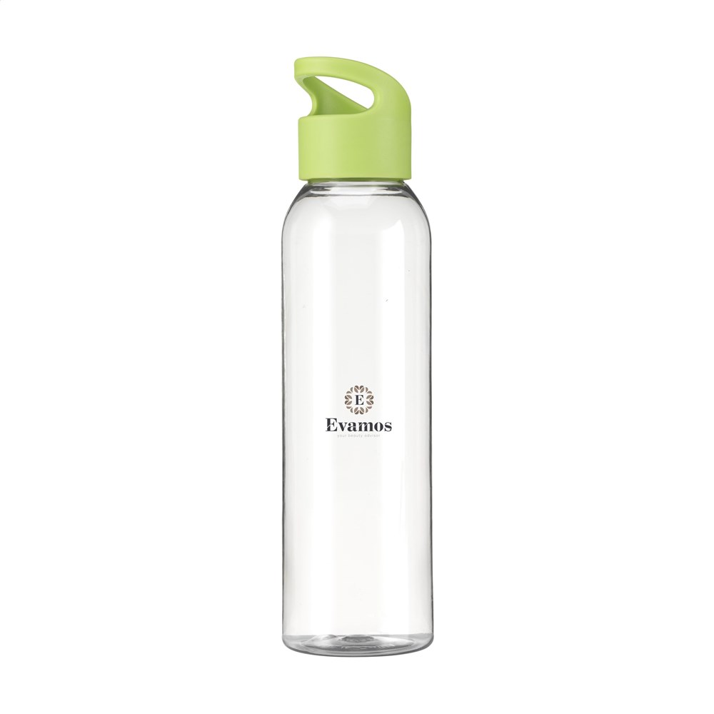 Luxury water bottle made from clear RPET. With a practical, plastic screw cap. Leak proof and re-usable. Not dishwasher safe. Capacity 650 ml. GRS-certified. Total recycled material: 82%.