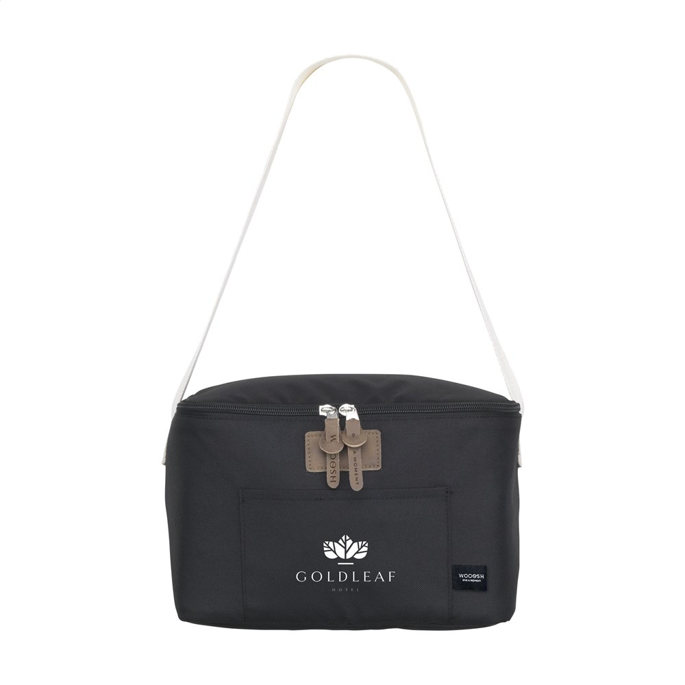 Stylish and functional cooler bag from the Wooosh brand. The outer fabric is made from 100% RPET 600D polyester. With a handy front pocket for a phone. The attractive accents, such as the luxurious zip pulls and the soft, woven carrying strap, immediately catch the eye. Thanks to the insulating layer, drinks and food stay perfectly warm. Ideal for a relaxing picnic, a day at the beach or for travelling. GRS-certified. Capacity approx. 7 litres.