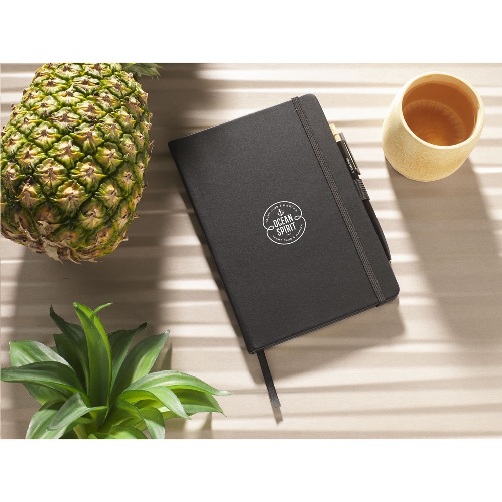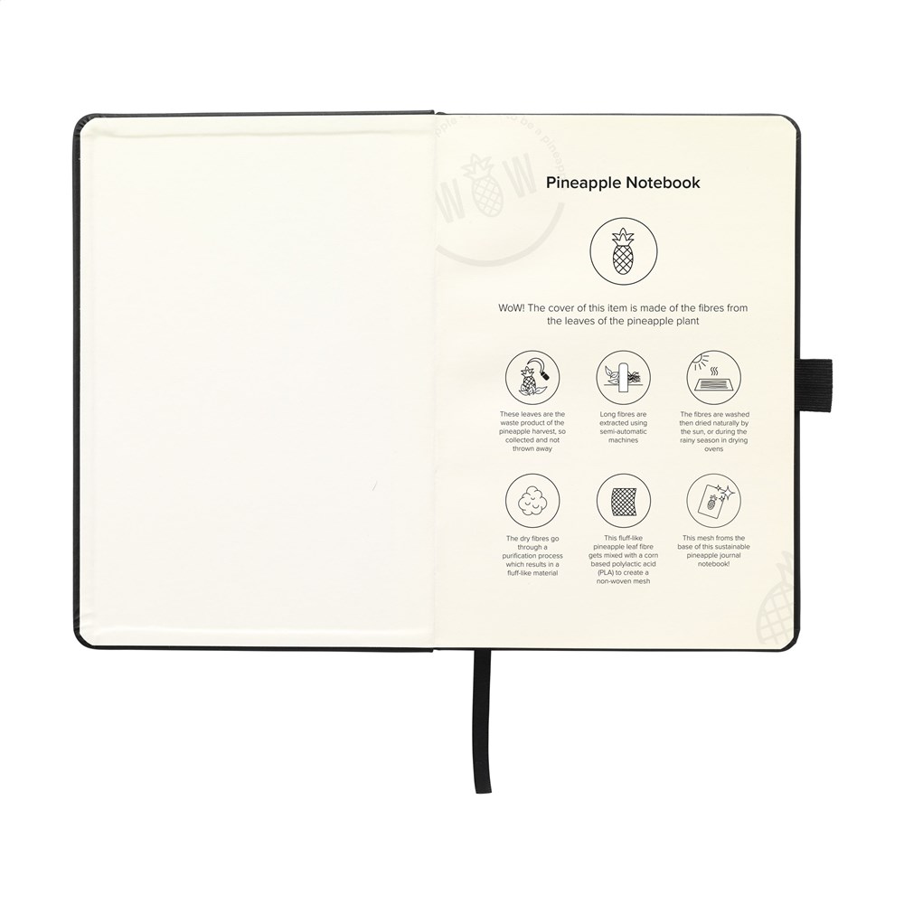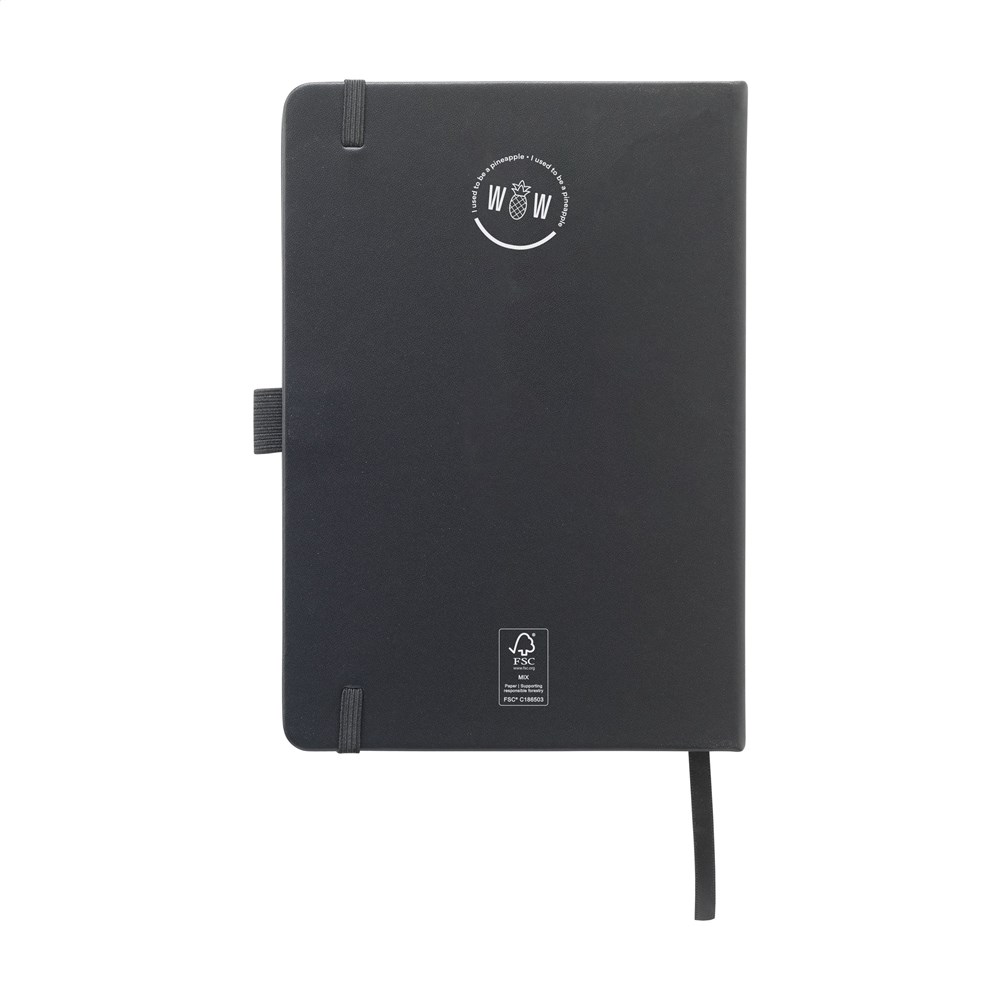 A5 notebook with a hard cover made from pineapple imitation leather. This material is made with 30% recycled pineapple components. This notebook has approx. 80 sheets/160 pages of white, lined FSC Mix certified paper (80 g/m²) and is equipped with an elastic closure, a bound spine, pen loop and reading ribbon. The vegan imitation leather is virtually indistinguishable from real leather. However, the material is made from pineapple leaves, a residual product from pineapple cultivation. For this reason, no additional substances are needed, such as water, fertilizer or pesticides for its production. The fibers of the pineapple leaves are washed, enriched with PU and dried in the oven. The result? Supple sheets of vegan imitation leather, which are then provided with a beautiful finish. After drying, a soft and attractive material with the properties of leather is created. It consists partly of fruit remains and partly of PU.