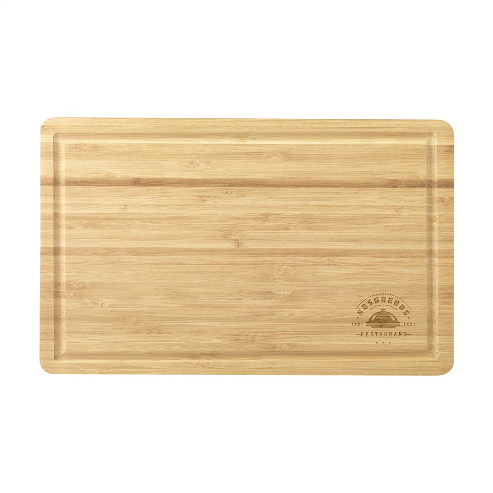 Quality bamboo chopping board with a circular groove for meat and/or fruit juices. NOTE: Due to the natural grains and contours of bamboo, we cannot guarantee consistency in depth/colour of the engraving. Packed individually.