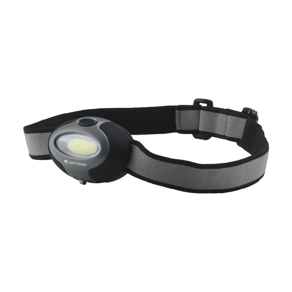 ABS headlight with COB LED. Emits a large bright, white light. On adjustable elastic strap. Extremely suitable for outdoor activities in the dark. Incl. cell batteries. Each item is supplied in an individual brown cardboard box.