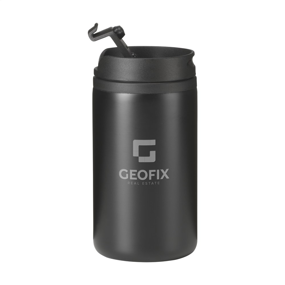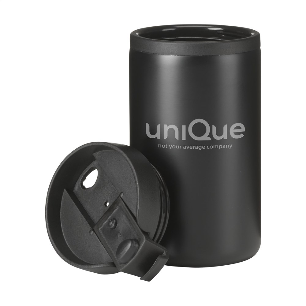 Double-walled thermos cup made from recycled stainless steel. With a plastic inner wall, screw lid and click-opening. Non-slip bottom. Not dishwasher-safe. RCS-certified. Total recycled material: 48%. Capacity 300 ml. Stainless steel can be recycled many times whilst retaining the quality of the material. By using recycled stainless steel, fewer new raw materials are needed. This means less energy consumption and less use of water. A responsible choice. Packed individually.