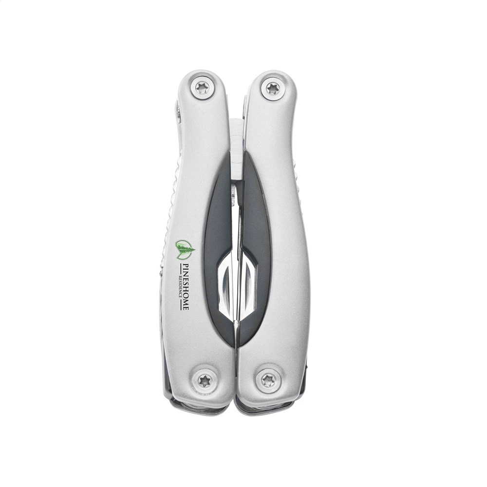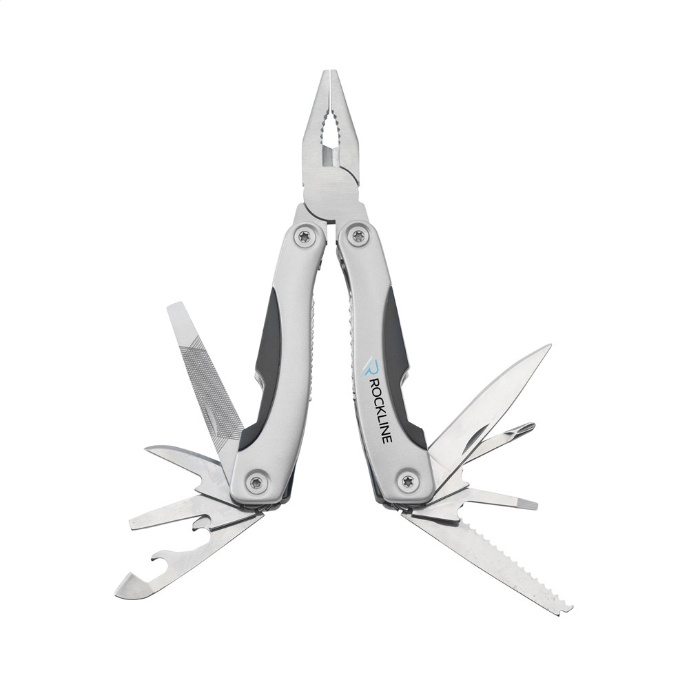 Compact stainless steel multi tool with aluminium hand grip and metallic look. 9-pieces with 13 functions: tongs, wire cutter, 3 screwdrivers, phillips screwdriver, file, saw/fish scraper, knife, reamer, can opener and cap lifter. In a 600D nylon pouch. Please note local rules may apply regarding the possession and/or carrying of knives or multitools in public. Each item is supplied in an individual brown cardboard box.
