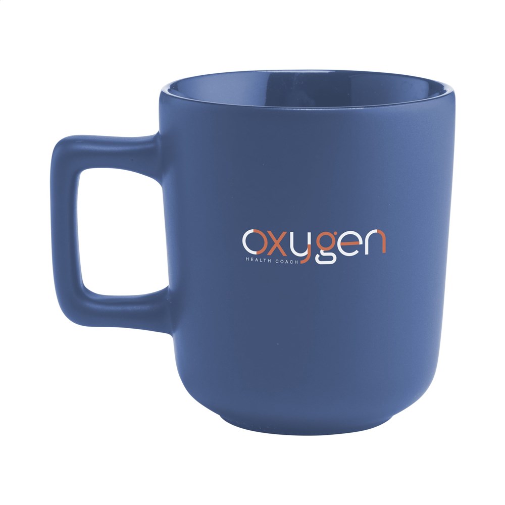 High-quality ceramic mug with a striking handle. Finished with a matte exterior and a high-gloss interior. Dishwasher-safe. The imprint is tested and certified dishwasher-safe: EN 12875-2. Capacity 280 ml. NOTE: The white mug cannot be laser engraved because it is not sufficiently visible.
