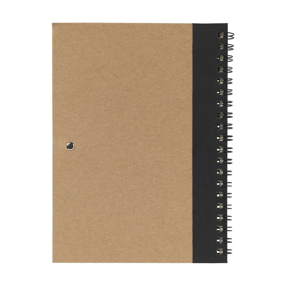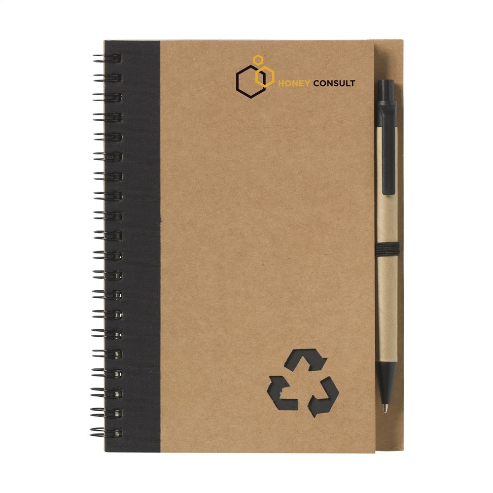 Notebook made from recycled material with approx. 70 sheets/140 pages of cream-coloured, lined paper (70 g/m²) and cardboard cover. Bound with a strong metal wire-o-binding. Incl. blue ink ballpoint. FSC Mix certified.