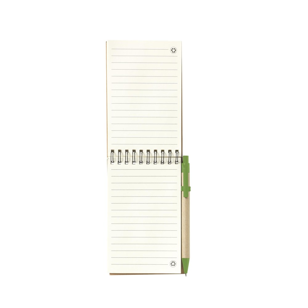 Notebook made from recycled materials, with approx. 70 sheets/140 pages of cream-coloured, lined paper (70 g/m²) and cardboard cover with elastic closure. Bound with strong metal wire-o-binding. Incl. blue ink ballpoint pen. FSC Mix certified.