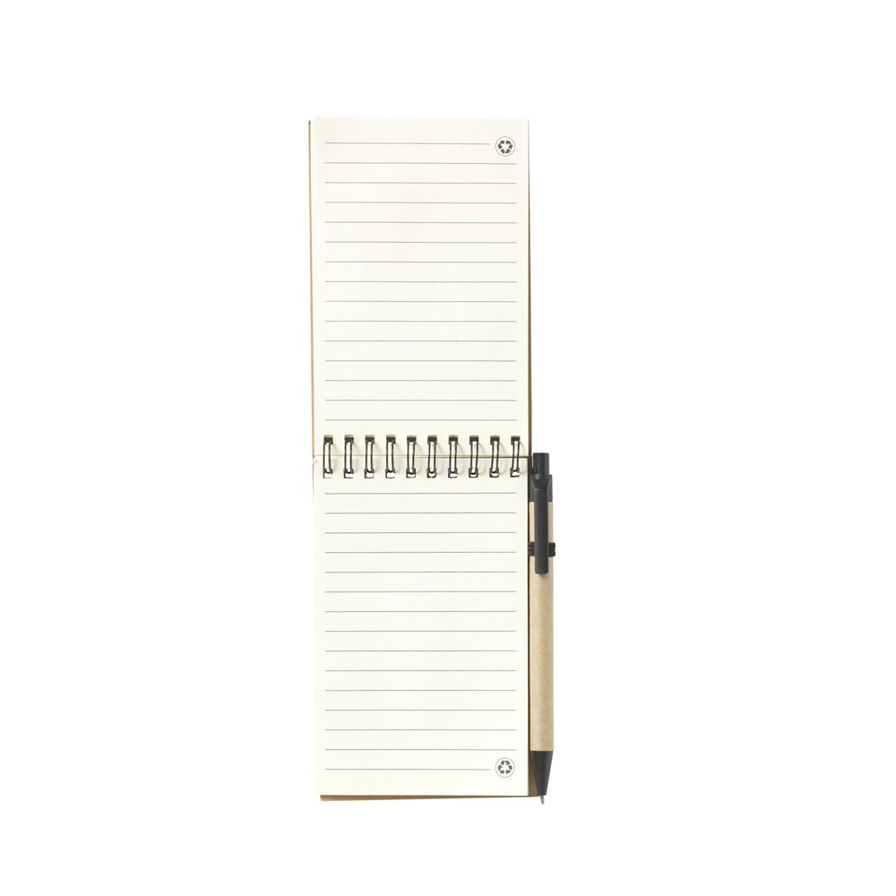 Notebook made from recycled materials, with approx. 70 sheets/140 pages of cream-coloured, lined paper (70 g/m²) and cardboard cover with elastic closure. Bound with strong metal wire-o-binding. Incl. blue ink ballpoint pen. FSC Mix certified.