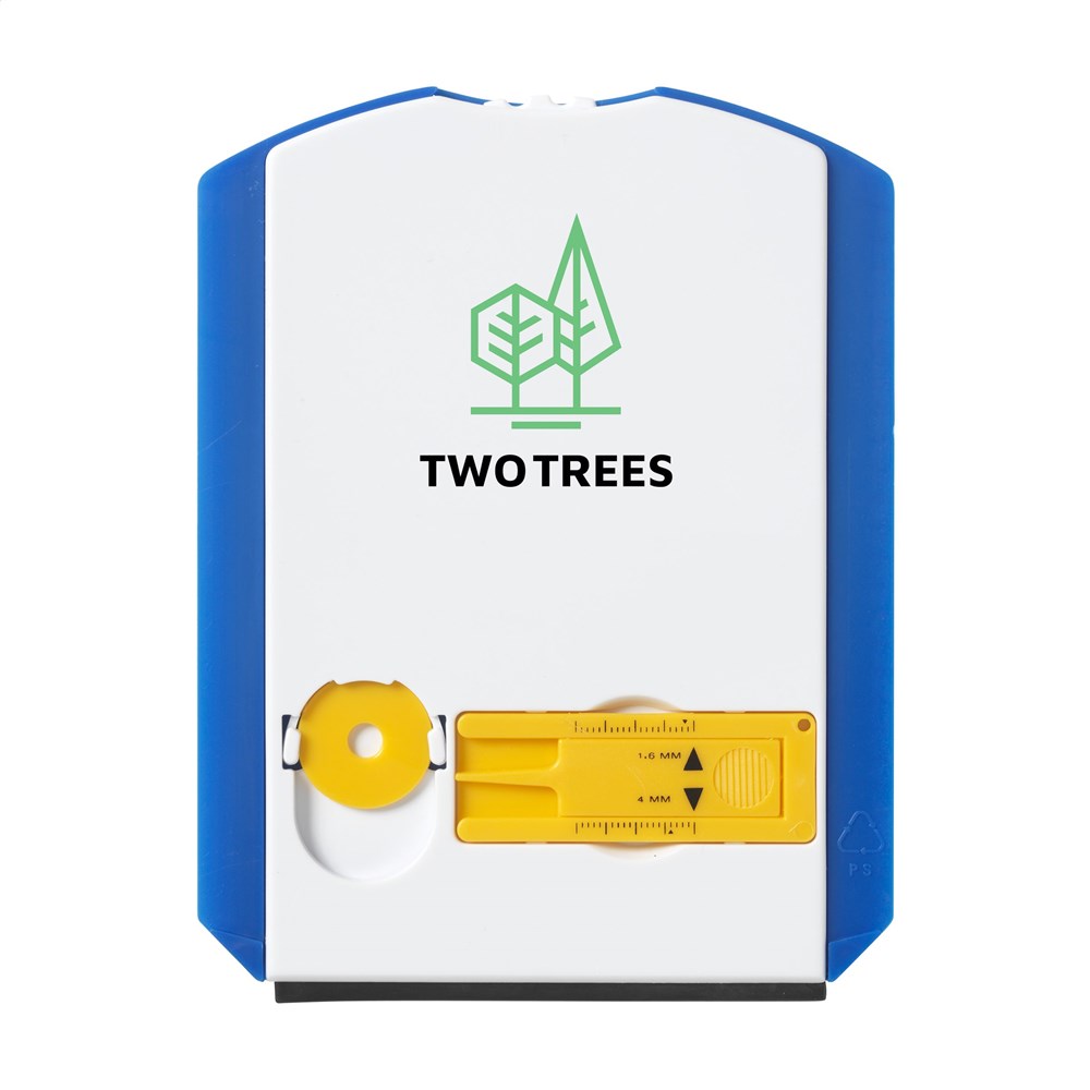 Plastic parking disk with ice scraper, rubber wiper, trolley coin and tyre tread depth gauge.