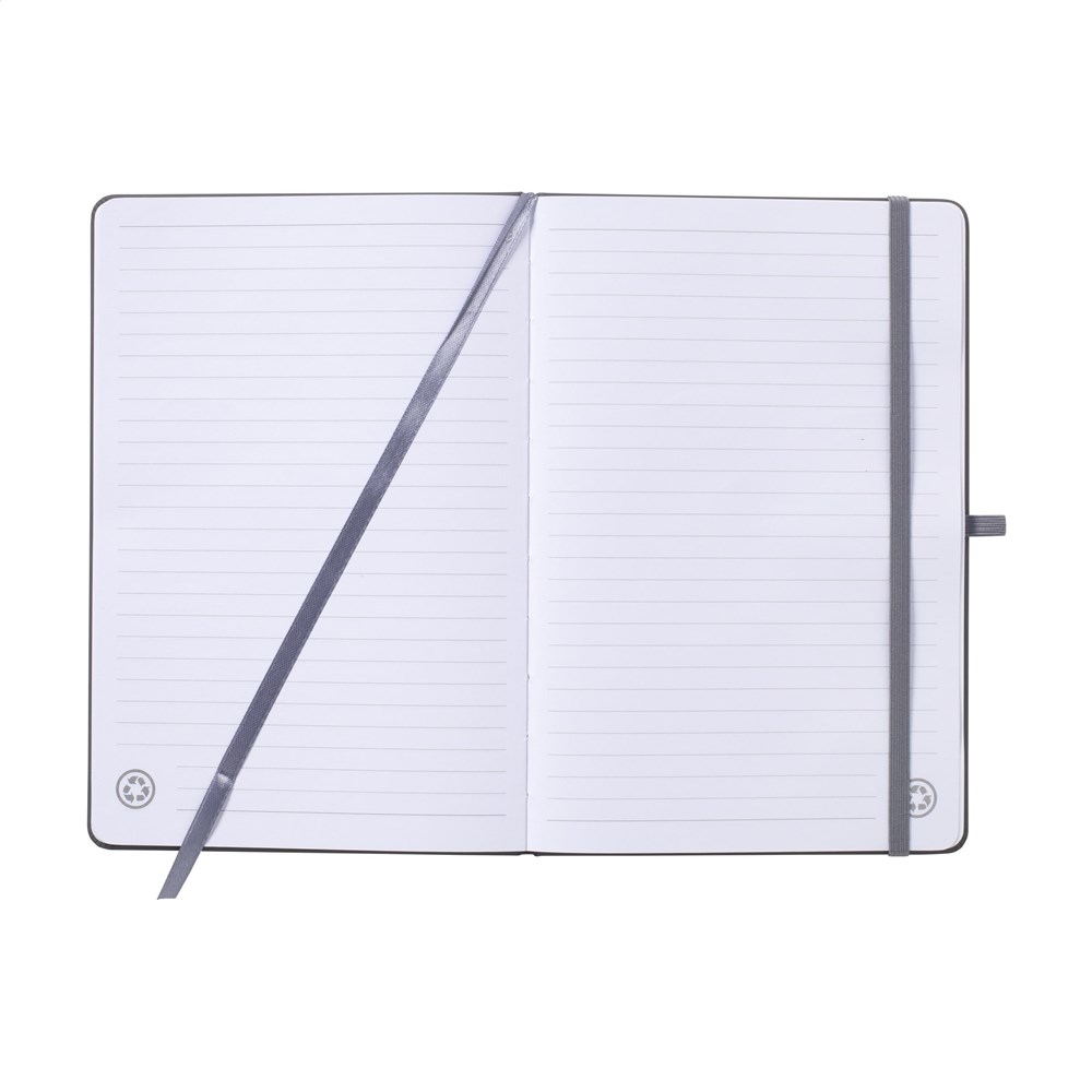 A5 notebook with hard cover made of recycled PU and approx. 96 sheets/192 pages of white, lined, GRS certified paper (70 g/m²). With bound spine, elastic closure and silk reading ribbon. GRS-certified. Total recycled material: 93%.