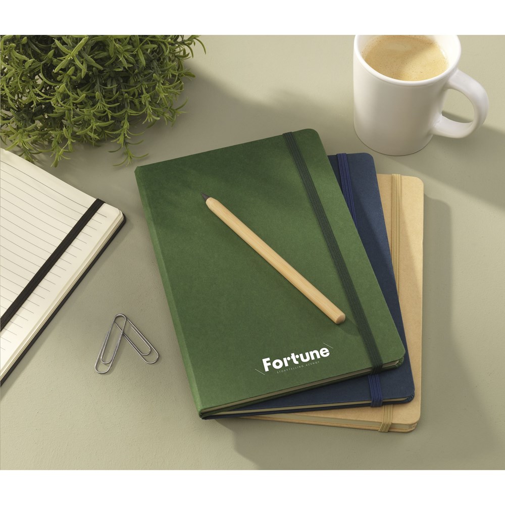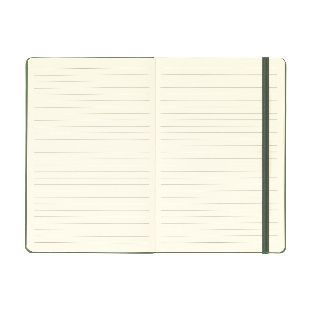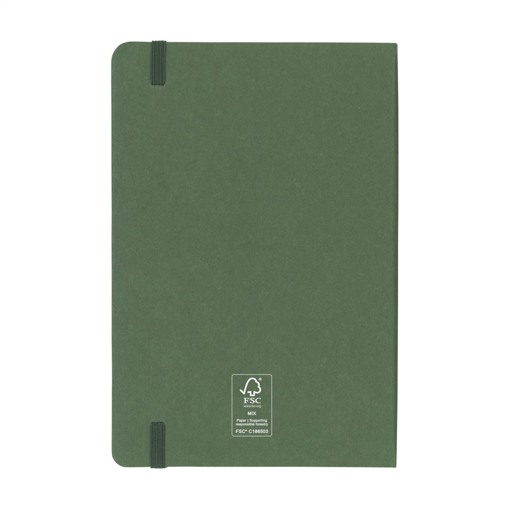 A5 notebook with a cover made from FSC Mix certified cardboard. The notebook has approx. 80 sheets/160 pages of cream-coloured, lined, FSC Mix certified paper (70 g/m²). With tie binding and a handy closing elastic.