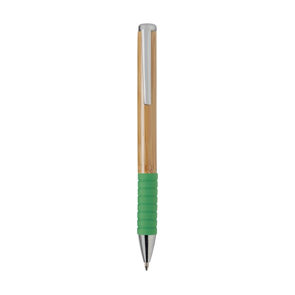 Blue ink ballpoint pen with bamboo holder, metal clip, turn-click system and coloured rubber non-slip grip. For an ecological impression.
