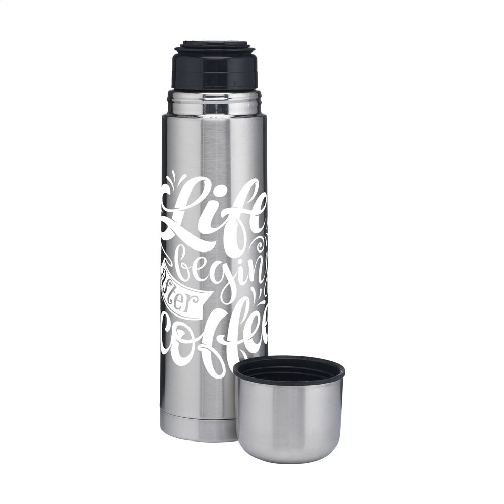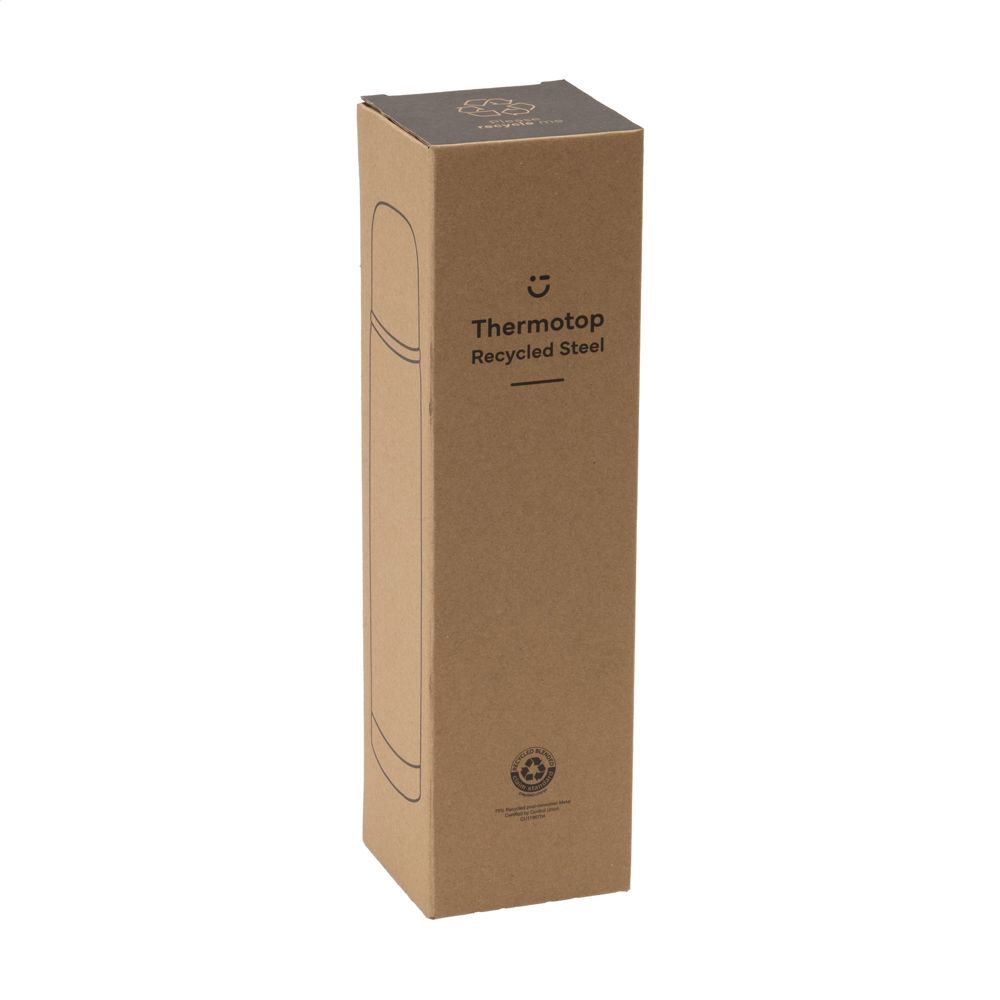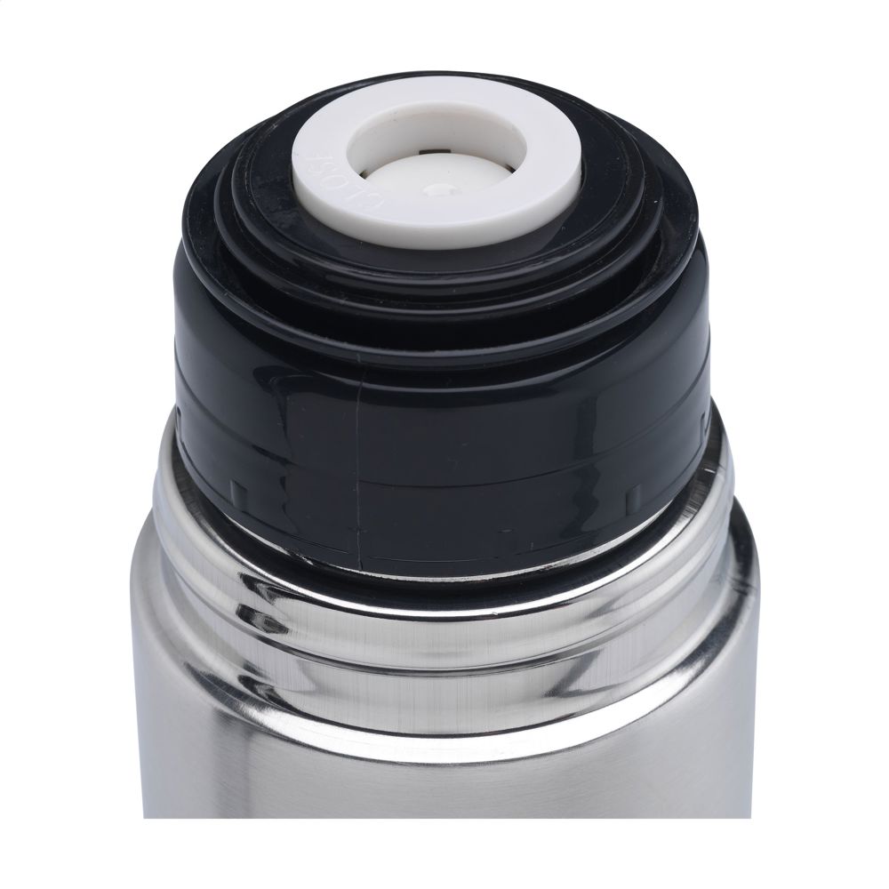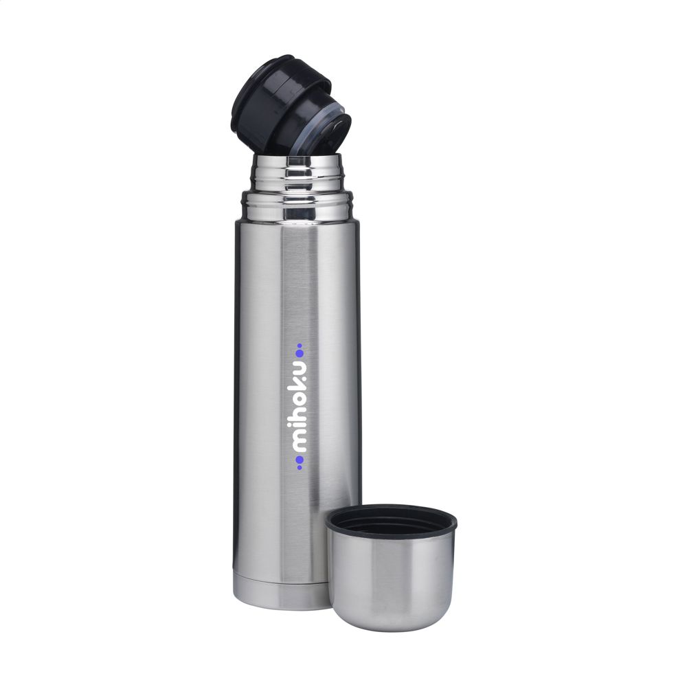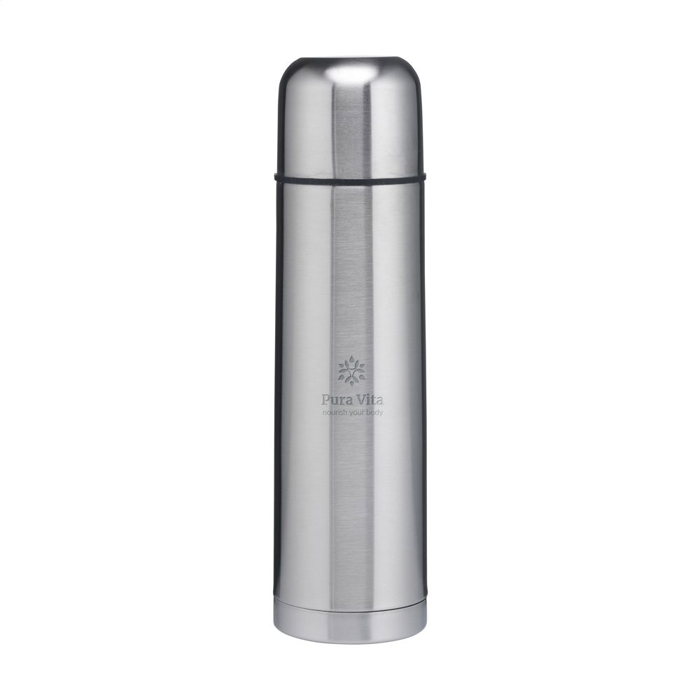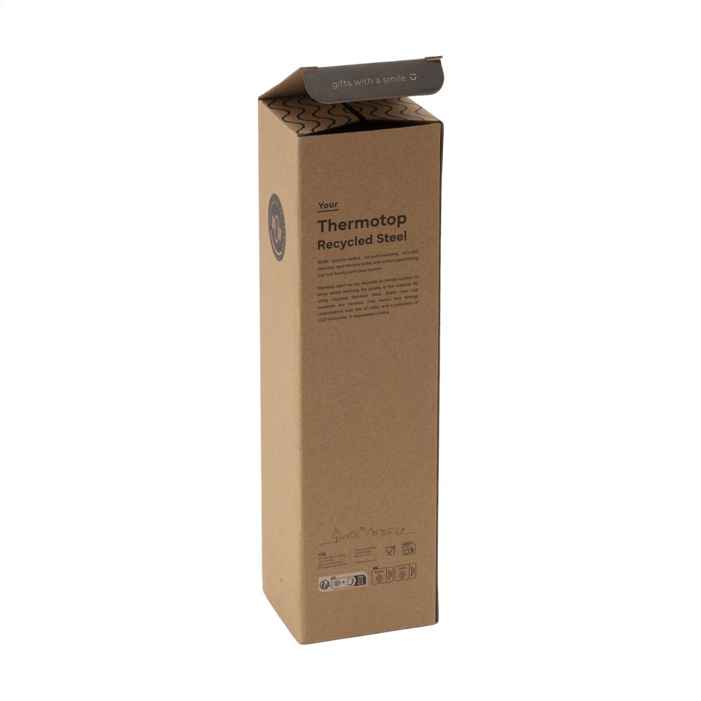 Double-walled, vacuum-insulated thermo bottle made from recycled stainless steel. Extremely durable and unbreakable. The vacuum between the walls insulates the contents and keeps drinks hot or cold for a longer period of time. With screw cap/drinking cup and handy push-pour system. Leak proof. Not dishwasher-safe. RCS-certified. Total recycled material: 75% Capacity 750 ml. Stainless steel can be recycled many times whilst retaining the quality of the material. By using recycled stainless steel, fewer new raw materials are needed. This means less energy consumption and less use of water. Packed individually.