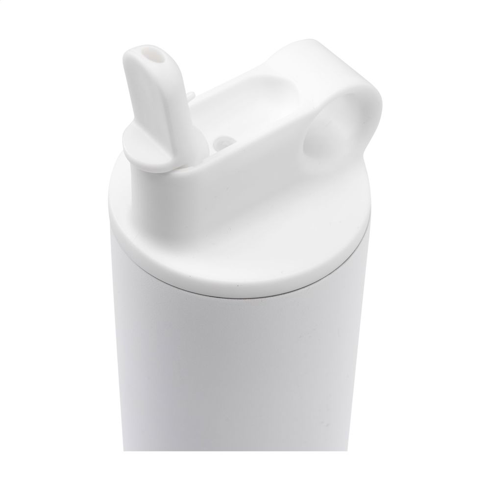 Double-walled, leak-proof water bottle/thermos bottle made from recycled stainless steel. Finished with a beautiful coating. The elegant bottle has a screw cap in a matching colour, a collapsible mouthpiece and a sealable straw. Thanks to the handy carrying ring, you can easily take the bottle with you. Suitable for cold drinks and ideal for use during sports activities. Not dishwasher safe. RCS-certified. Total recycled material: 83%. Capacity 800 ml. Stainless steel can be recycled many times whilst retaining the quality of the material. By using recycled stainless steel, fewer new raw materials are needed. This means less energy consumption and less use of water. Packed individually.