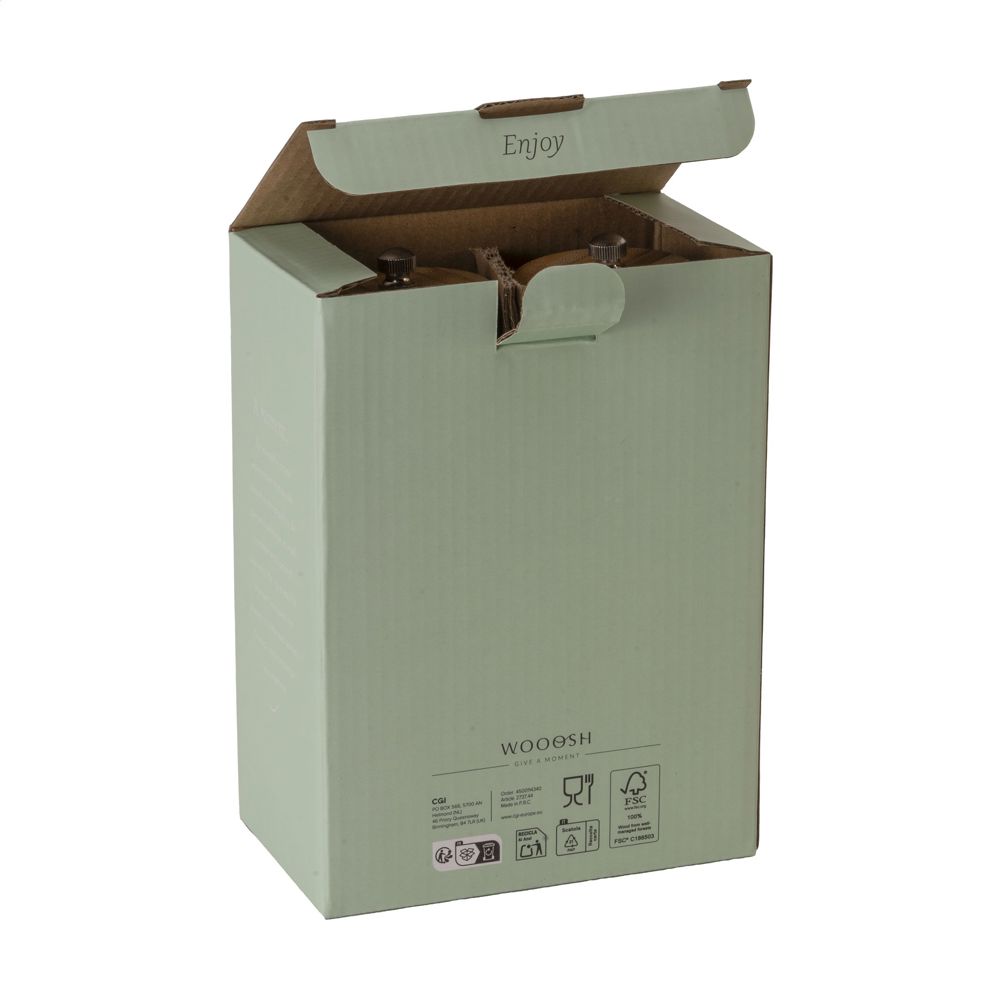 Salt and pepper set from the Wooosh brand. Made from FSC 100% certified bamboo. Both mills feature a ceramic grinder for long-lasting and efficient use. Both parts are refillable and come with a stylish bamboo tray that ensures a neat presentation on the table. This set combines functionality with a modern look, perfect for use in the hospitality industry or as a tasteful addition to the kitchen. Each set is supplied in an individual gift box.
