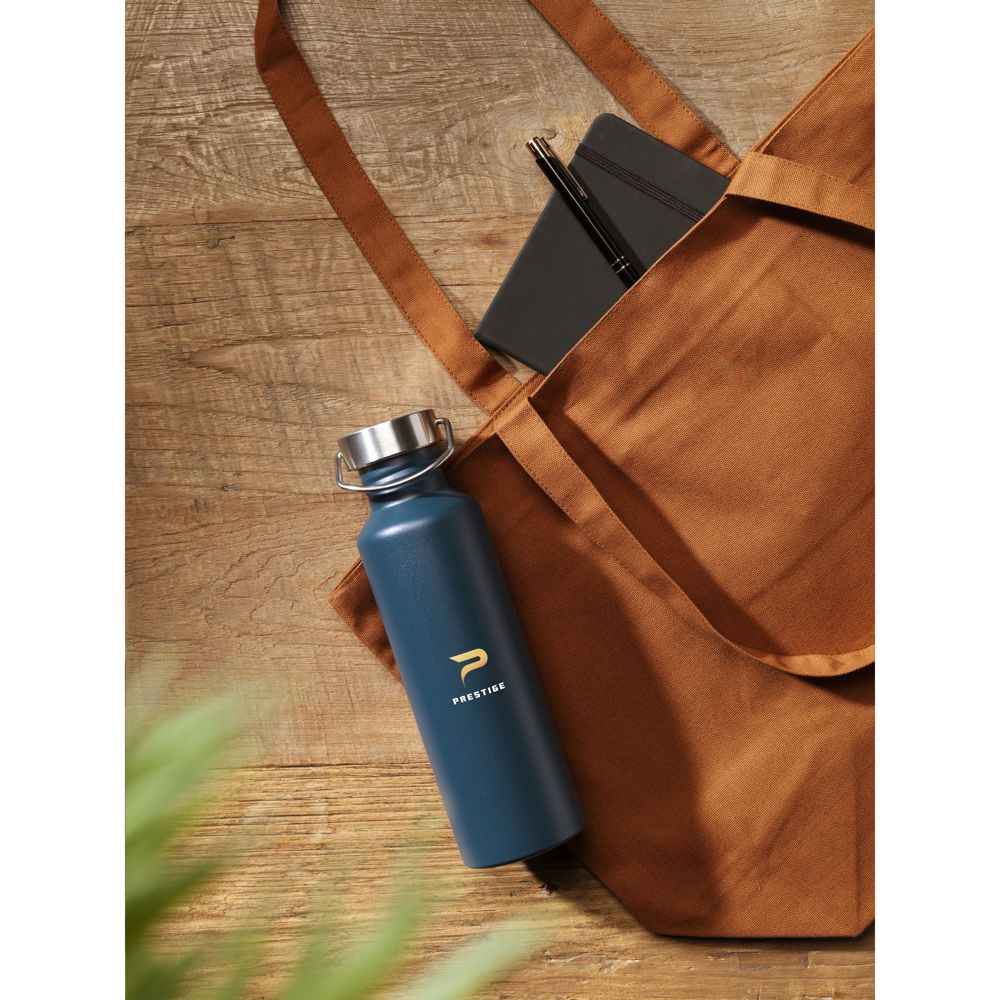 Single-walled, leak-proof water bottle with screw cap and carrying ring. Made from recycled stainless steel. Not dishwasher-safe. RCS-certified. Total recycled material: 75%. Capacity 800 ml. Stainless steel can be recycled many times whilst retaining the quality of the material. By using recycled stainless steel, fewer new raw materials are needed. This means less energy consumption and less use of water. A responsible choice. Packed individually.