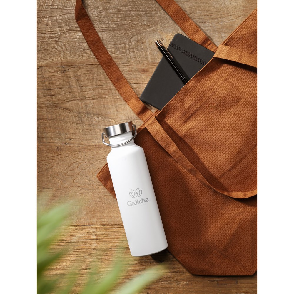 Single-walled, leak-proof water bottle with screw cap and carrying ring. Made from recycled stainless steel. Not dishwasher-safe. RCS-certified. Total recycled material: 75%. Capacity 800 ml. Stainless steel can be recycled many times whilst retaining the quality of the material. By using recycled stainless steel, fewer new raw materials are needed. This means less energy consumption and less use of water. A responsible choice. Packed individually.
