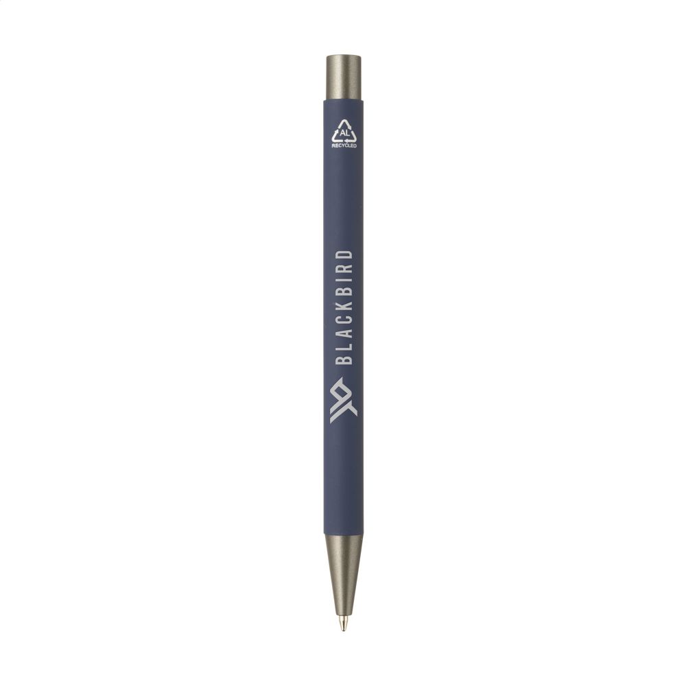 Blue ink ballpoint pen with a barrel made from 100% GRS-certified recycled aluminium. The barrel has a rubberised soft touch finish. The simple design without a clip gives the pen a modern, elegant look. RCS-certified. Total recycled material: 81%. By using recycled aluminium, fewer new raw materials are used during the production of this product. This means less energy consumption and less use of water.