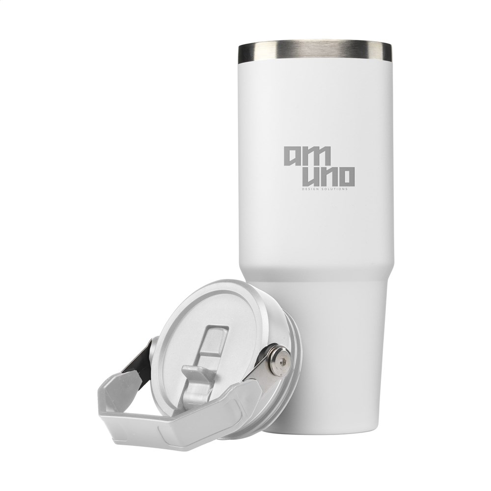 Large, double-walled drinking cup made from recycled stainless steel with straw. The striking, sturdy mug has a large, swivel handle and a screw-on lid with a collapsible drinking spout and a straw. This huge mug keeps drinks at temperature for a long time. Suitable for cold and hot drinks. This mug can go anywhere. Ideal for the gym or the office. The tapered, narrow bottom means the cup fits into almost any cup holder, making it perfect for travelling. Total recycled material: 73%. Capacity 900 ml. Packed individually.