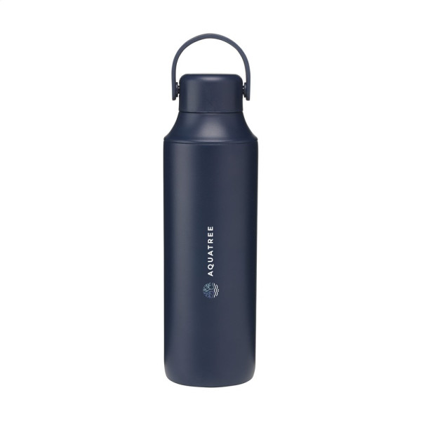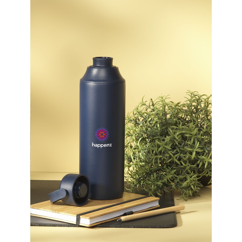 Double-walled thermos bottle made from recycled stainless steel. This leak proof bottle has a silicone carrying loop and 2 openings with a screw cap: a drinking opening and a generous opening for easy cleaning of the bottle or adding ice cubes. Fits most cup holders and is finished with a beautiful powder coating. Suitable for keeping hot or cold drinks at a consistent temperature. Not dishwasher-safe. RCS-certified. Total recycled material: 72%. Capacity 600 ml. Stainless steel can be recycled many times whilst retaining the quality of the material. By using recycled stainless steel, fewer new raw materials are needed. This means less energy consumption and less use of water. Packed individually.