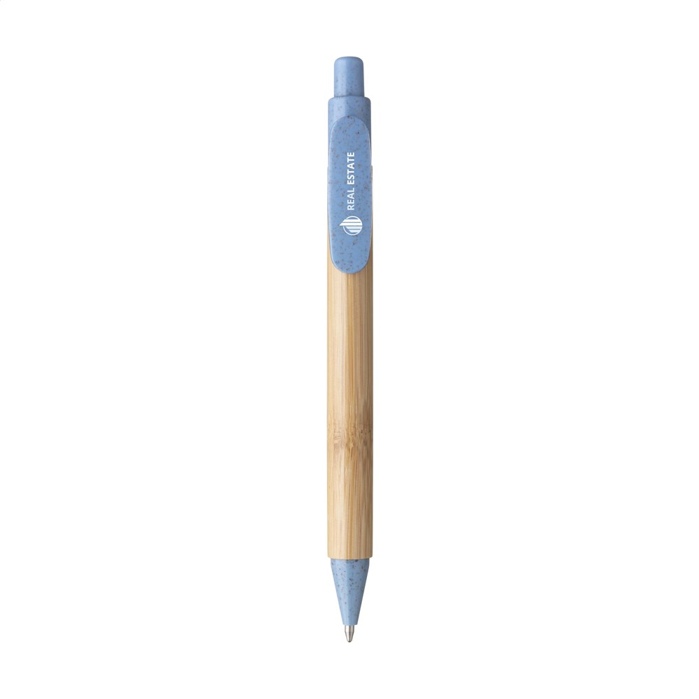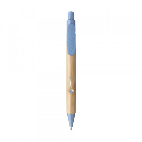 Blue ink ballpoint pen with bamboo barrel. The clip, push button and point section are made from wheat straw/PP plastic.