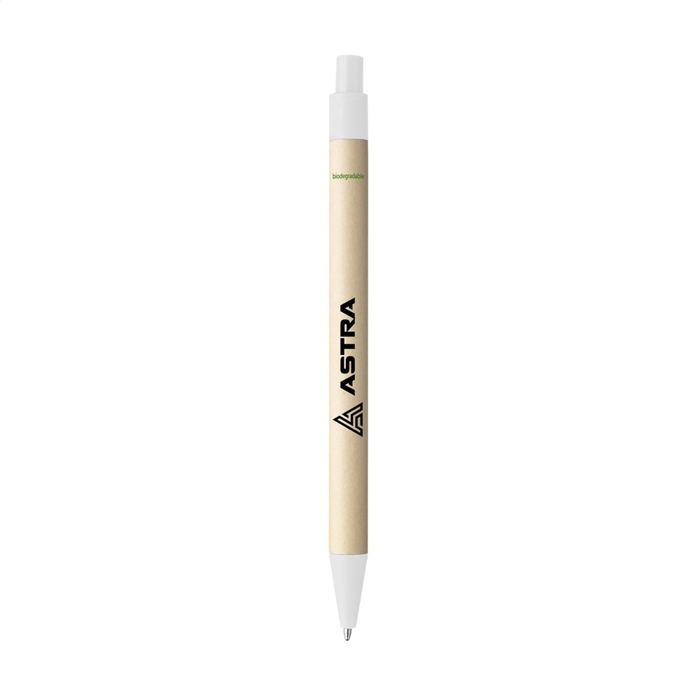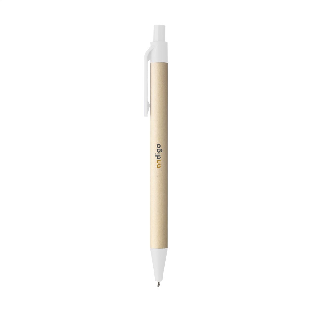 Blue ink ballpoint pen with a barrel made from recycled paper. The coloured clip, push button and point are made from biodegradable PLA.
