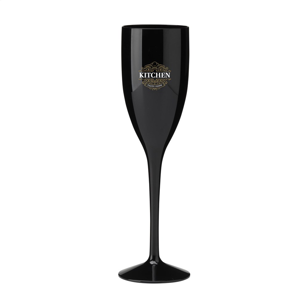 Reusable, luxury champagne glass made from polycarbonate. Virtually unbreakable. The plastic glass has a chic, festive look and is a popular eye-catcher at events, weddings and garden parties. The glass is dishwasher safe. Washing by hand is recommended to preserve the imprint. Capacity 150 ml. Made in Europe.