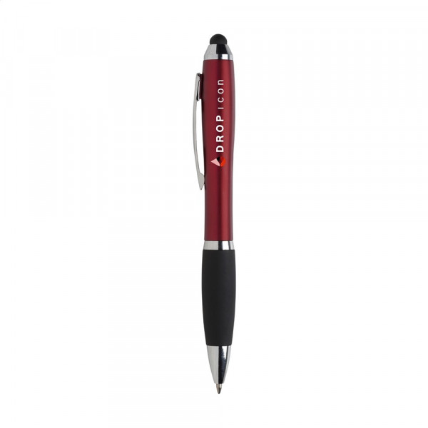 Blue ink ballpoint pen with coloured barrel, rubber grip, glossy accents, recess in metal clip and rubber top/pointer to operate touch screens (eg iPhone/iPad).