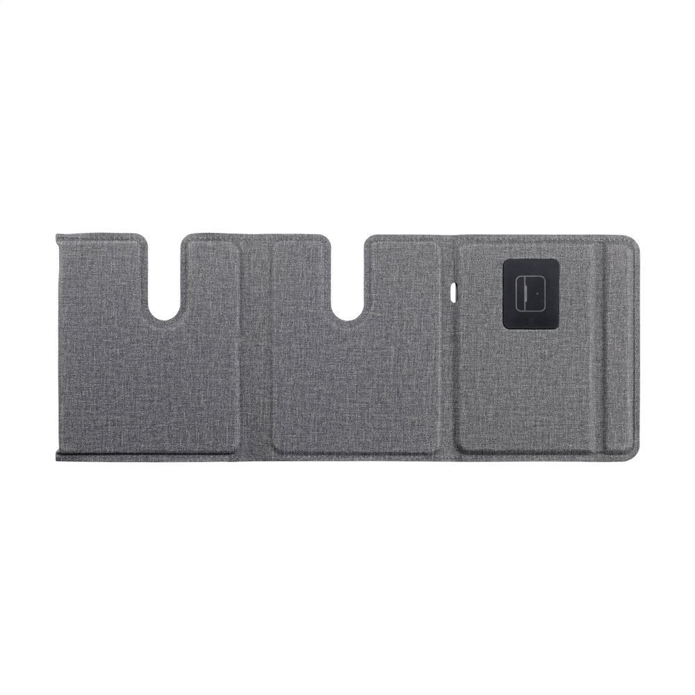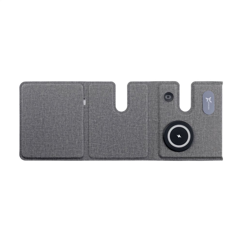 3-in-1 magnetic wireless 15W charger made from recycled ABS and recycled PU with a grey blended pattern. This charging station supports fast wireless charging: 15W for a mobile phone 2.5W for your iWatch and 3W for TWS earphones. Input: 1 x USB-C 9V/3A. The built-in, magnetic fast charger is compatible with all devices that support Qi wireless charging. Place this docking station on your desk and your workspace stays tidy and your devices charged. Foldable and easy to carry. Includes USB-C/USB-C charging cable and user manual. RCS certified. Total recycled material: 49%. Packed individually.
