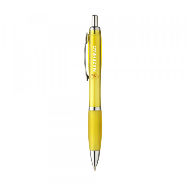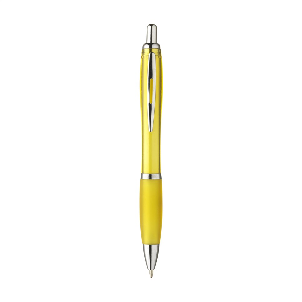 Blue or black ink ballpoint pen with transparant coloured barrel, non-slip grip and metal clip.