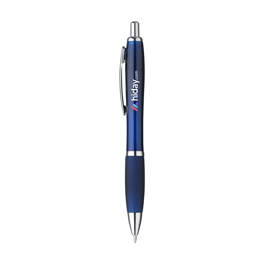 Blue or black ink ballpoint pen with transparant coloured barrel, non-slip grip and metal clip.