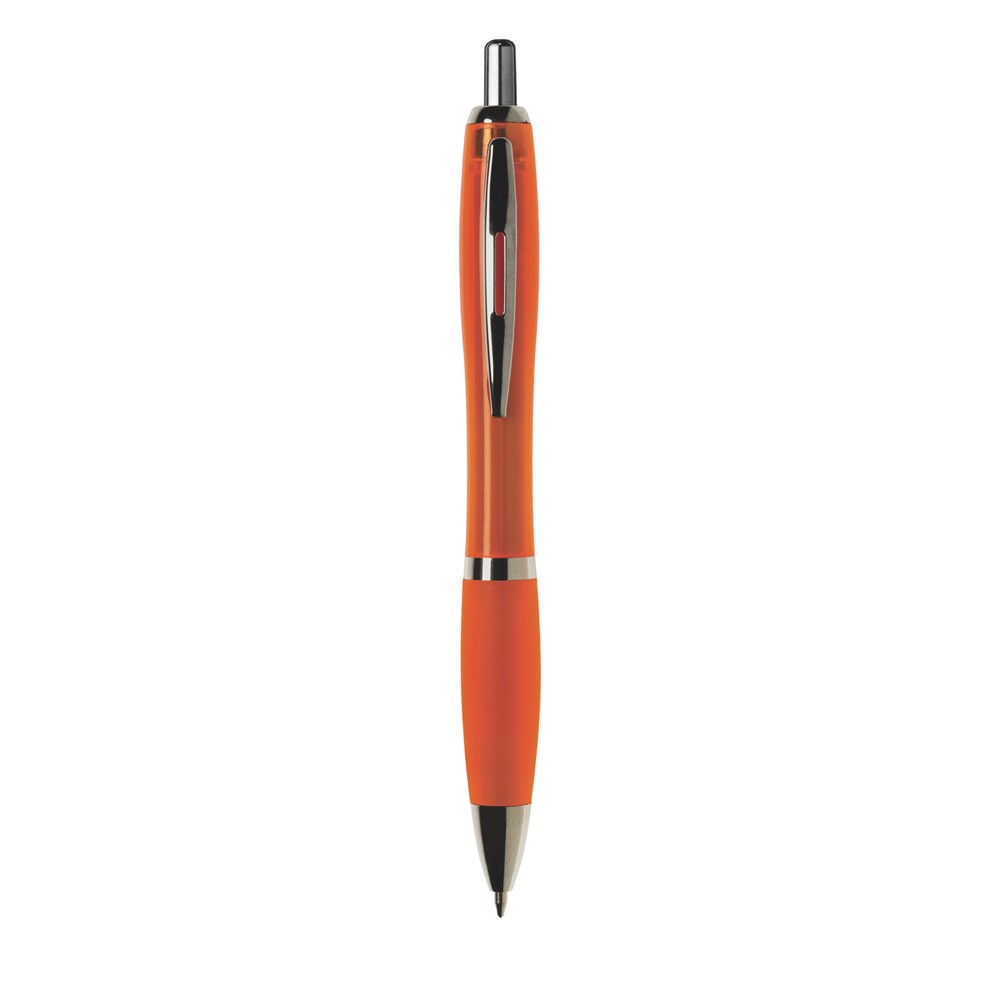 Blue or black ink ballpoint pen with transparant coloured barrel, non-slip grip and metal clip.
