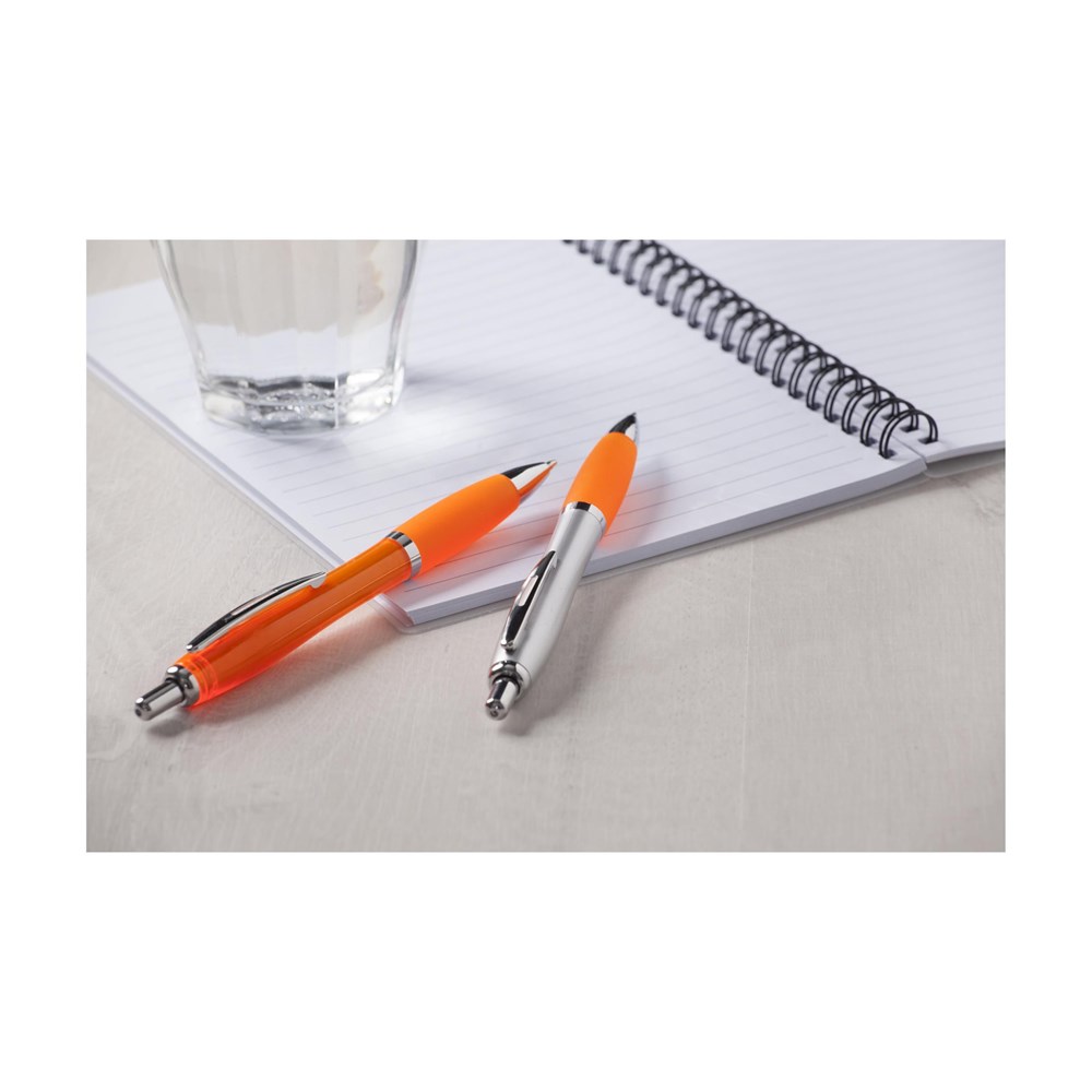 Blue or black ink ballpoint pen with transparant coloured barrel, non-slip grip and metal clip. more