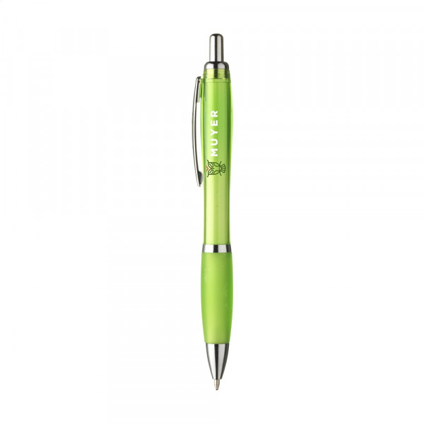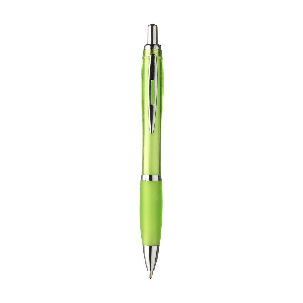 Blue or black ink ballpoint pen with transparant coloured barrel, non-slip grip and metal clip.