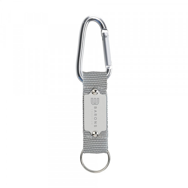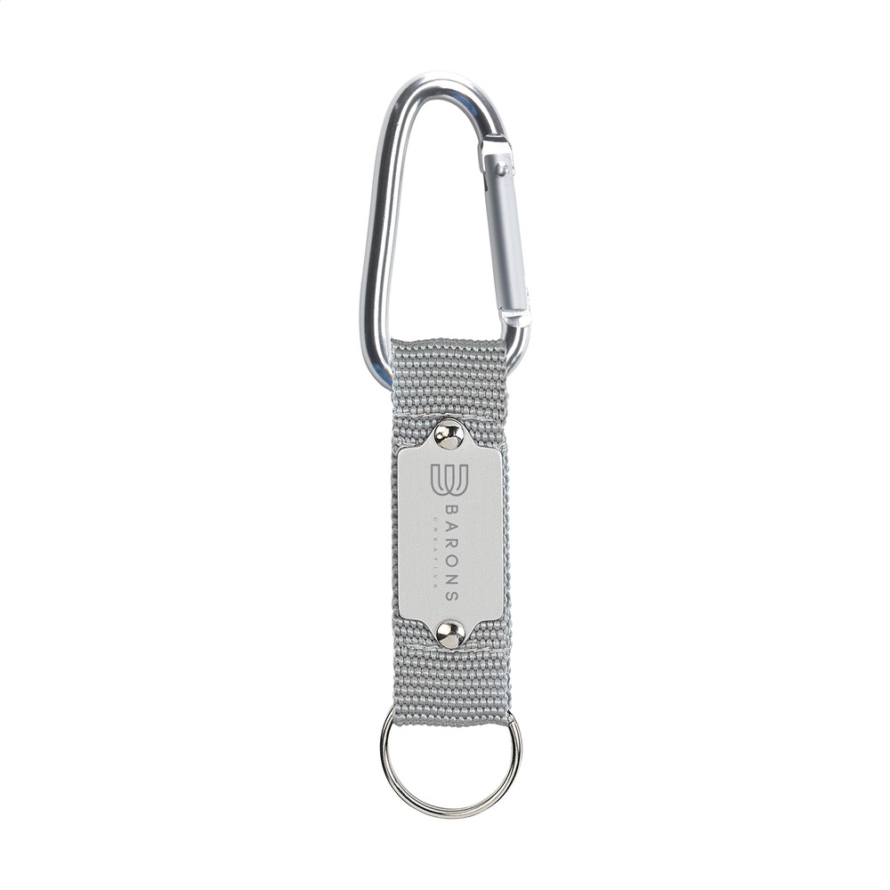 Carabiner hook with woven nylon strap and sturdy keyring.