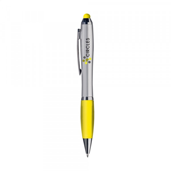Blue ink ballpoint pen with coloured rubber top/pointer to operate touch screens (eg iPhone/iPad), metallic look barrel, non-slip grip, recess in metal clip and twist mechanism.