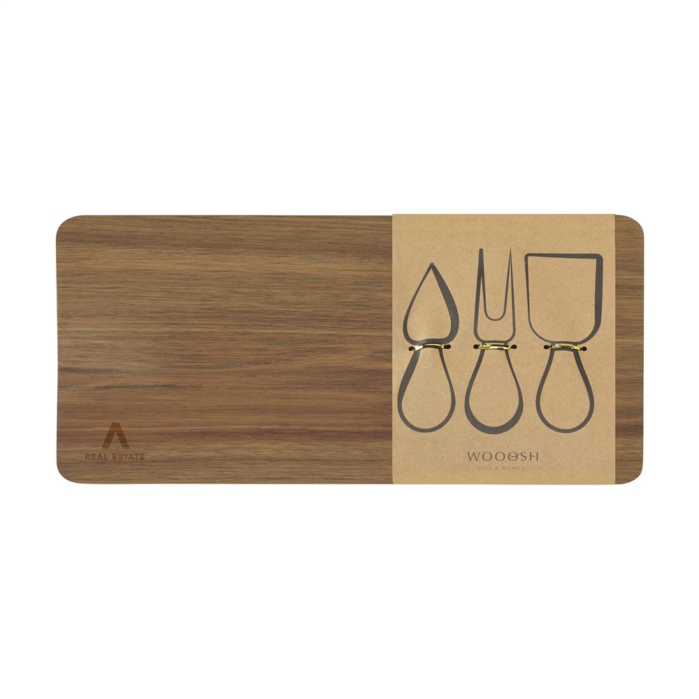 Exclusive Wooosh cheese board made from FSC 100% certified acacia wood. Including 2 cheese knives and 1 cheese fork. The cheese knives are specially designed for easy cutting and serving of both hard and soft cheeses, while the cheese fork is ideal for picking up and serving pieces of cheese. Acacia wood is a robust type of wood with a warm appearance. The artistic characteristics of acacia wood include fine grain, a flame-like pattern and changing shades of colour all combining to give this board a unique character. This serving board has been carefully treated with a vegetarian soybean oil. Thanks to the bactericidal properties of acacia, this board is naturally hygienic. With this complete cheese board you create an attractive setting for a pleasant gathering full of tasty moments. Each set is supplied in an individual gift box.