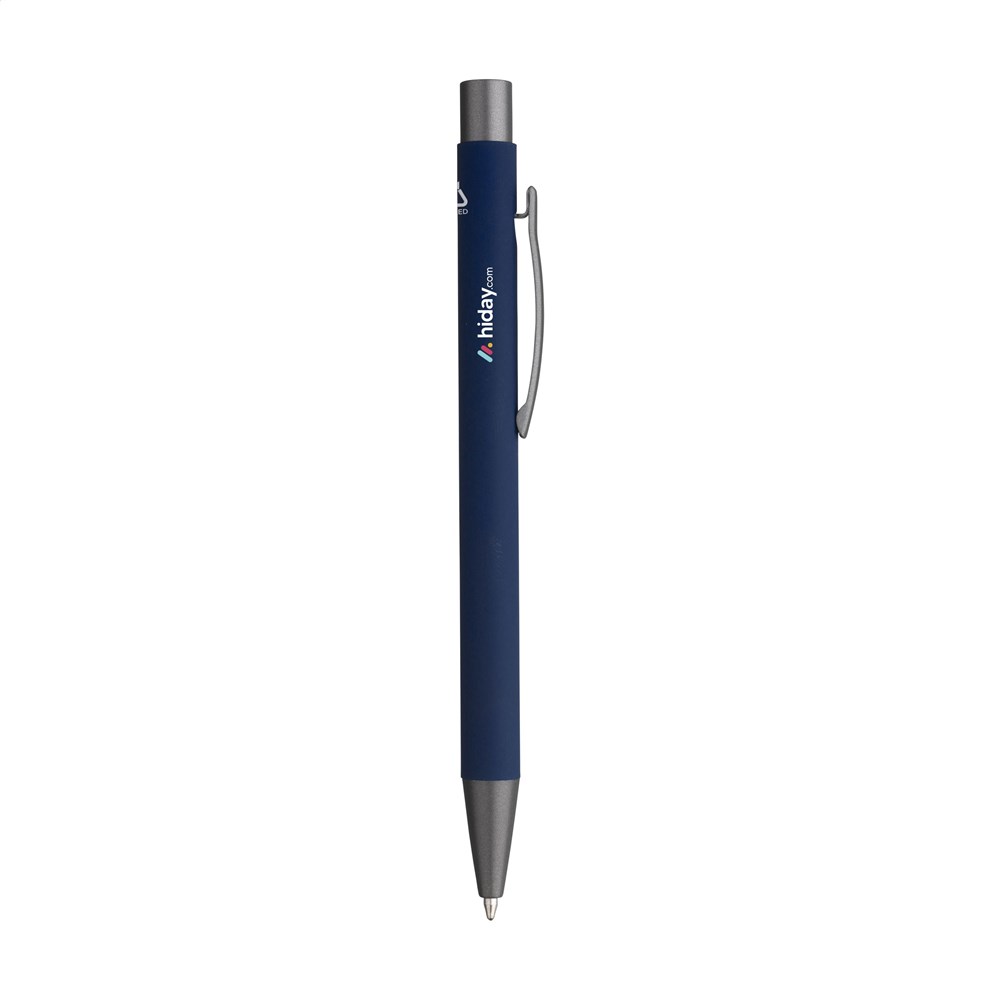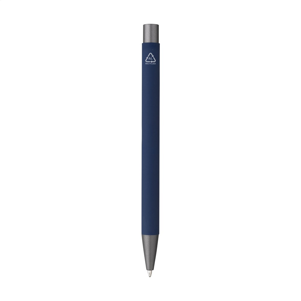 Blue ink ballpoint pen made from recycled aluminium. This pen has a barrel covered with an attractive rubberised coating and has a sturdy metal clip, a plastic tip and a push button. The use of recycled aluminium means that fewer new raw materials are used. This means less energy consumption, less use of water and a reduction of CO2 emissions.