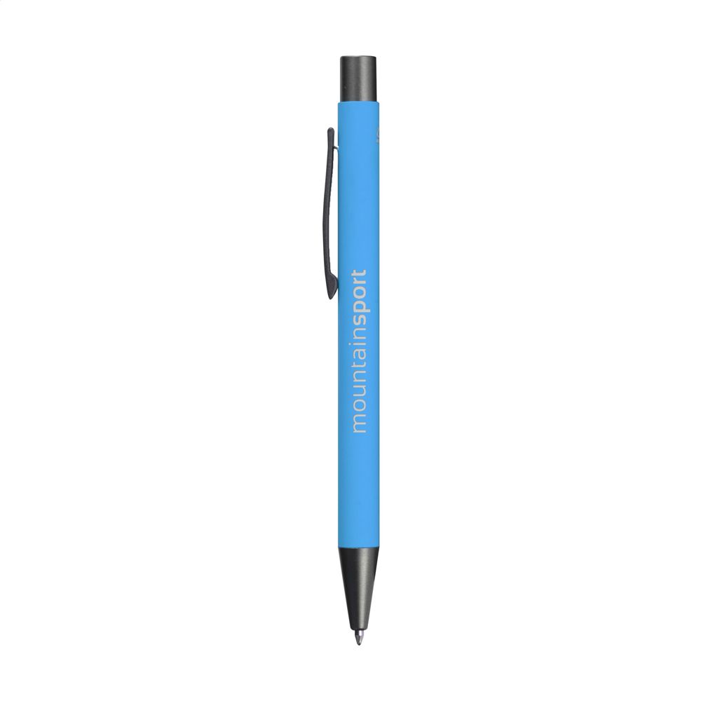 Blue ink ballpoint pen made from recycled aluminium. This pen has a barrel covered with an attractive rubberised coating and has a sturdy metal clip, a plastic tip and a push button. The use of recycled aluminium means that fewer new raw materials are used. This means less energy consumption, less use of water and a reduction of CO2 emissions.