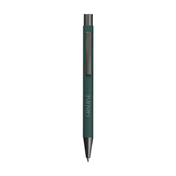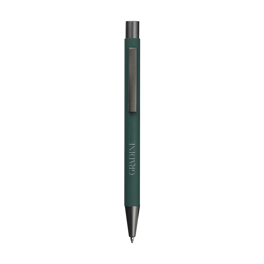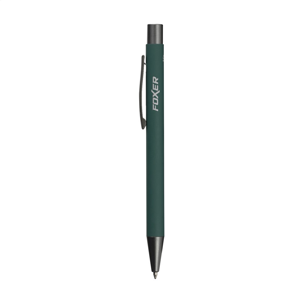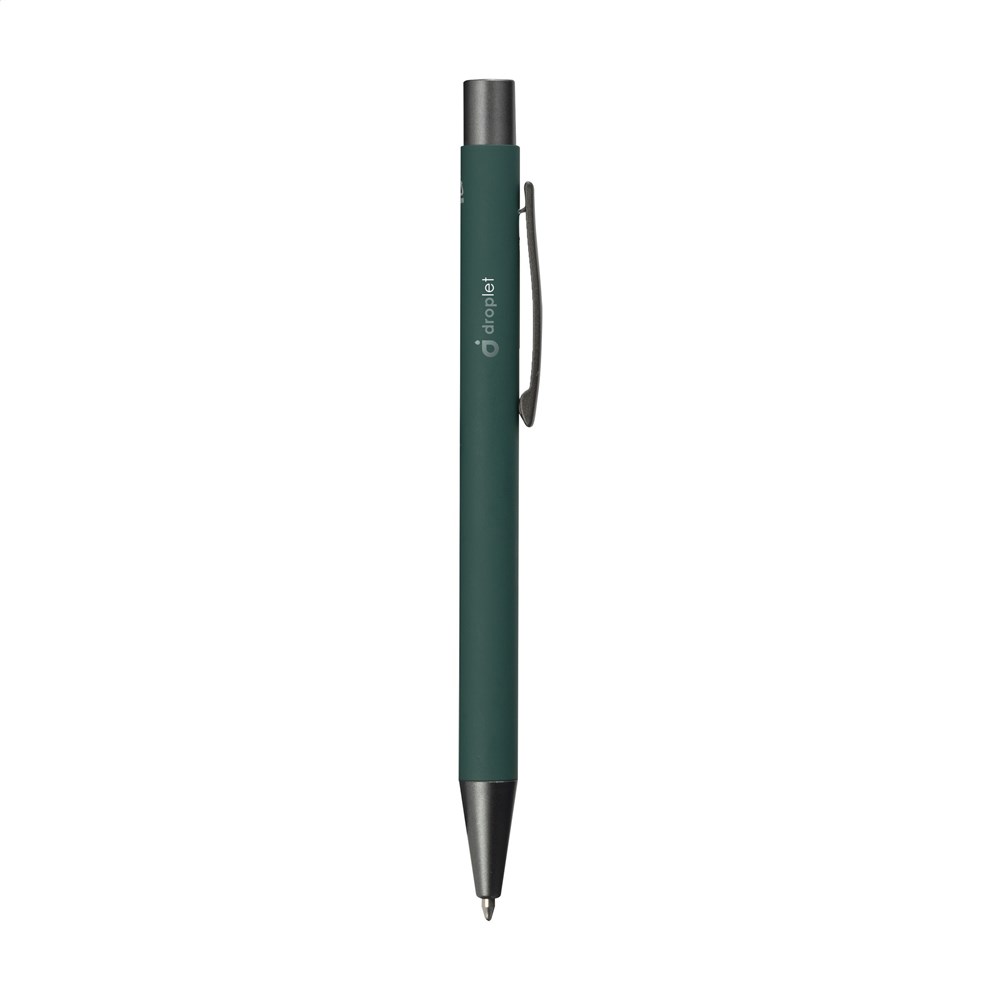 Blue ink ballpoint pen made from recycled aluminium. This pen has a barrel covered with an attractive rubberised coating and has a sturdy metal clip, a plastic tip and a push button. The use of recycled aluminium means that fewer new raw materials are used. This means less energy consumption, less use of water and a reduction of CO2 emissions.