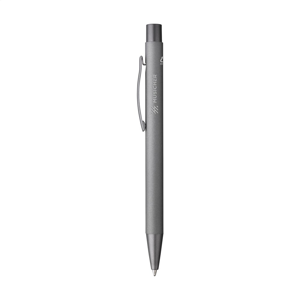 Blue ink ballpoint pen made from recycled aluminium. This pen has a barrel covered with an attractive rubberised coating and has a sturdy metal clip, a plastic tip and a push button. The use of recycled aluminium means that fewer new raw materials are used. This means less energy consumption, less use of water and a reduction of CO2 emissions.