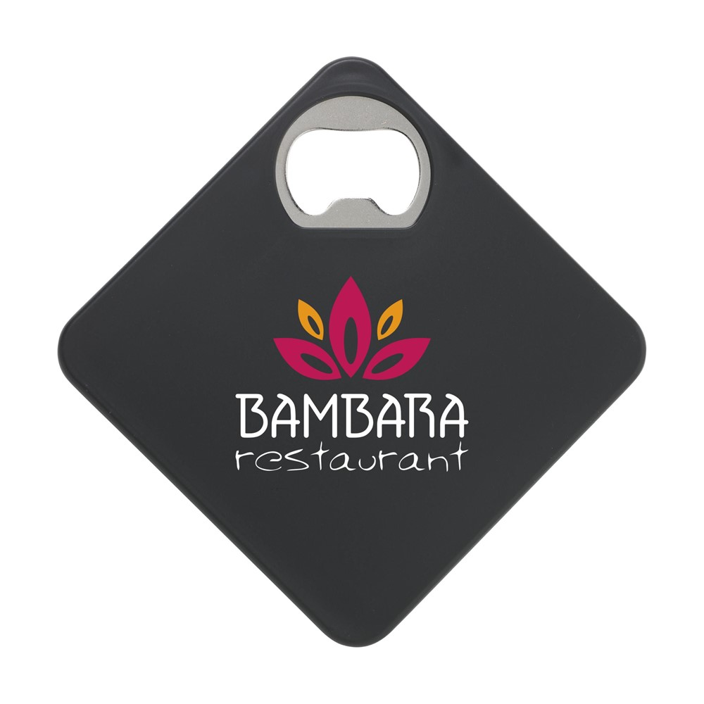 Coaster and metal opener in one. With non-slip base. Can be printed with your own photo, logo or own design in full colour. Very suitable for sending as a mailbox gift.