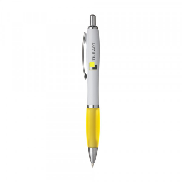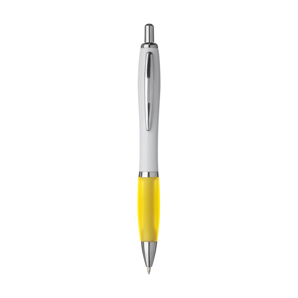 Blue or black ink ballpoint pen with white barrel with coloured, non-slip grip and metal clip.