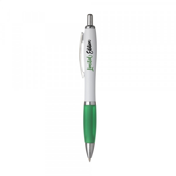 Blue or black ink ballpoint pen with white barrel with coloured, non-slip grip and metal clip.