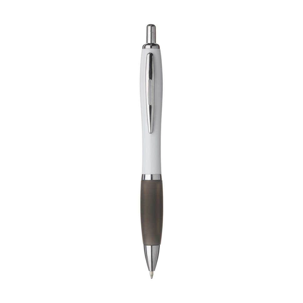 Blue or black ink ballpoint pen with white barrel with coloured, non-slip grip and metal clip.