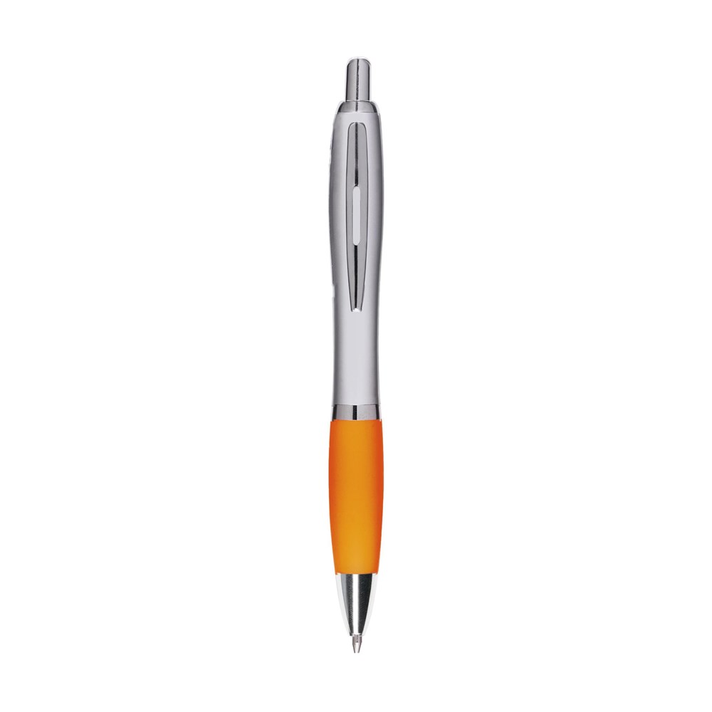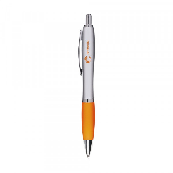 Blue ink ballpoint pen with coloured non-slip grip and metal clip.