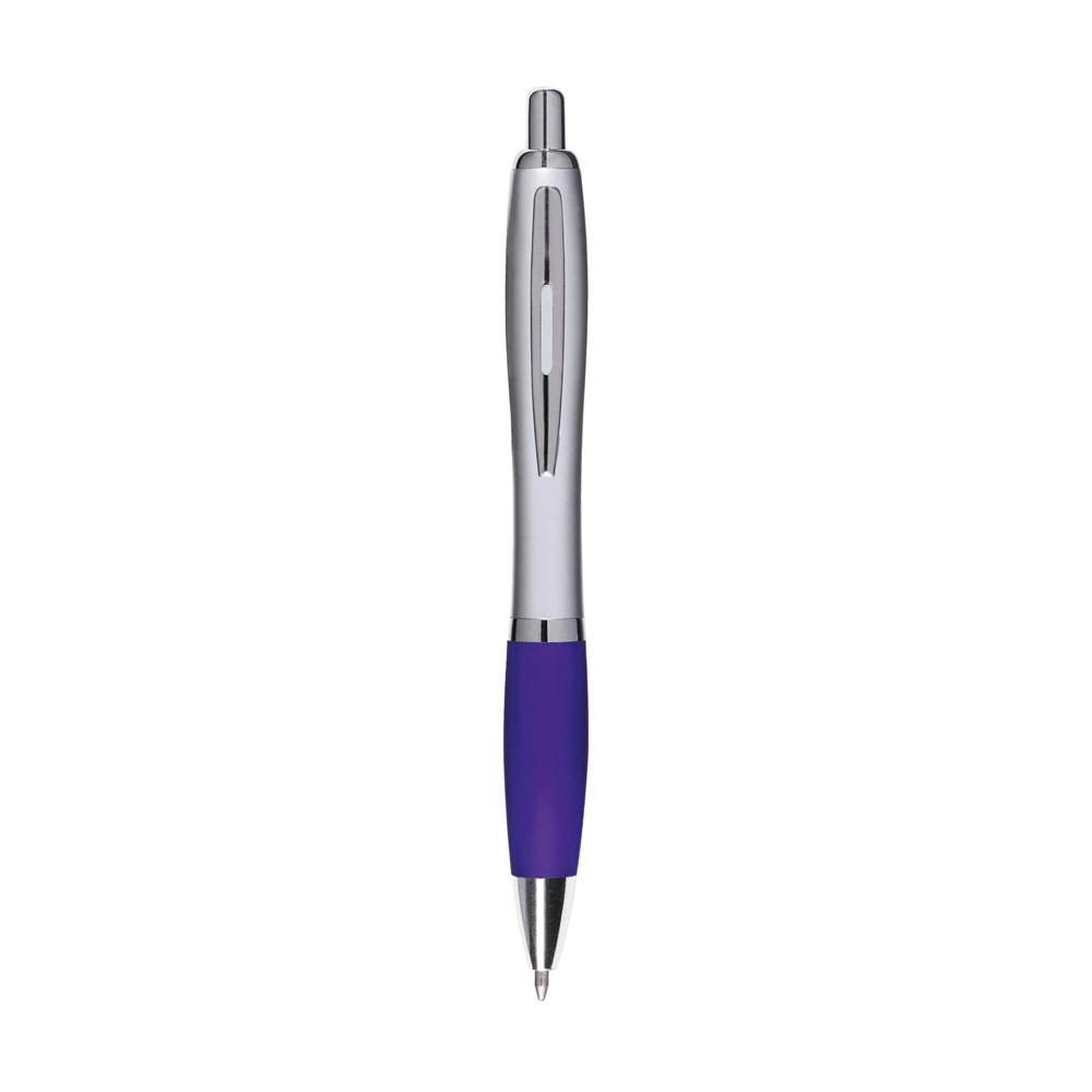 Blue ink ballpoint pen with coloured non-slip grip and metal clip.