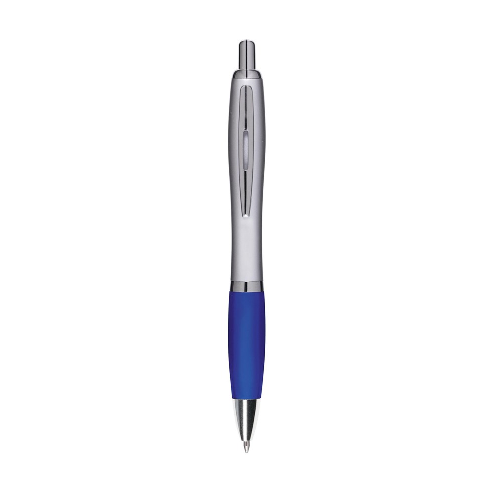 Blue ink ballpoint pen with coloured non-slip grip and metal clip.