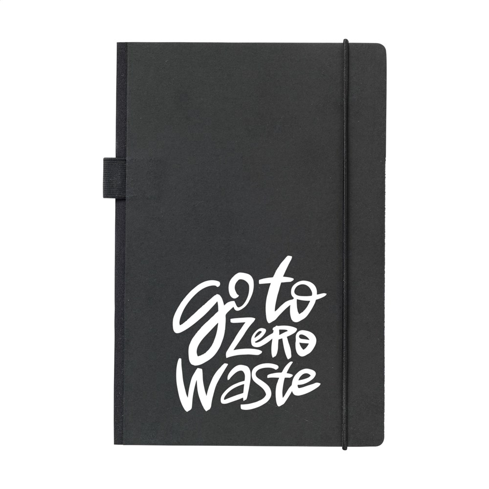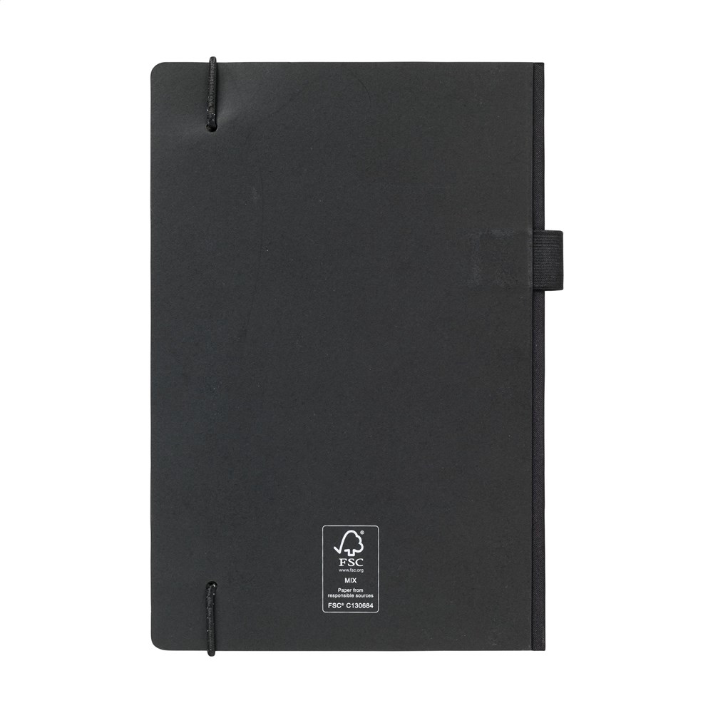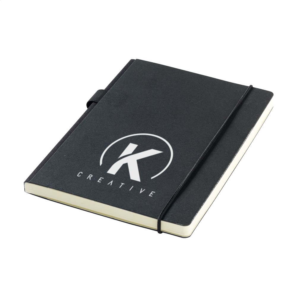 Practical notebook in A5 format. With a hard cover made from kraft cardboard (300 g/m²). This booklet has approx. 80 sheets/160 pages of cream-coloured, lined FSC Mix certified paper (80 g/m²) with a handy closing elastic and pen loop. On the inside of the back cover, you will also find a handy storage compartment.