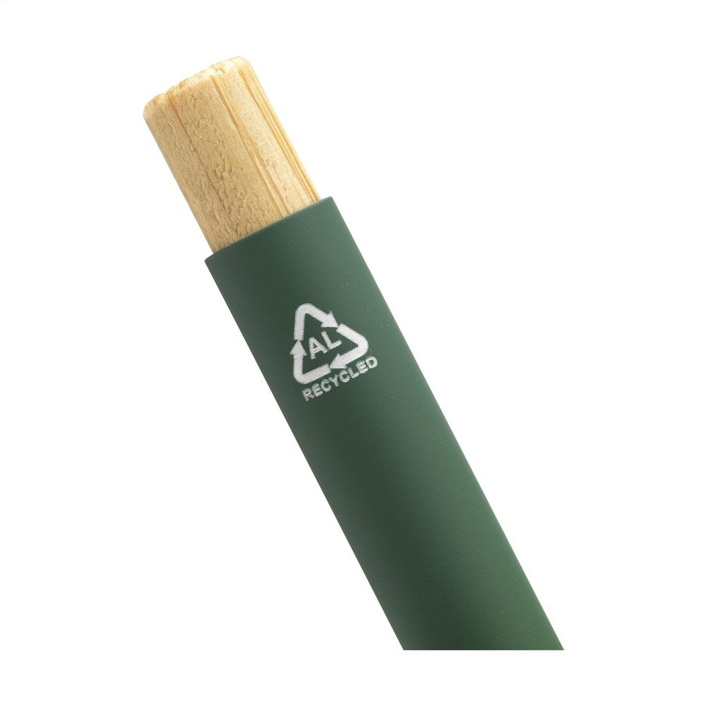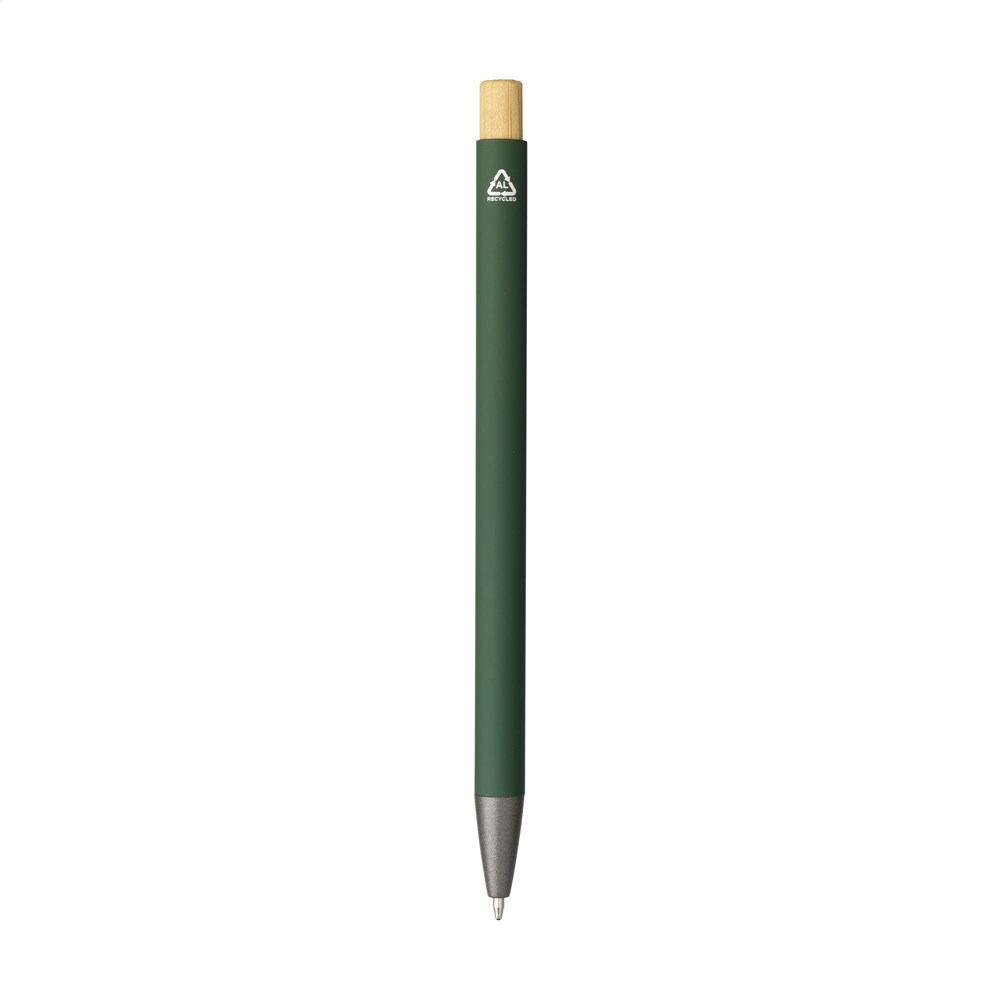 Blue ink, slim ballpoint pen with barrel made from 100% recycled aluminium with a rubberised finish. Metal clip. Sleek design. The bamboo push button gives the pen a natural touch. GRS-certified. The use of recycled aluminium means that fewer new raw materials are used in production. This means less energy consumption and less use of water.
