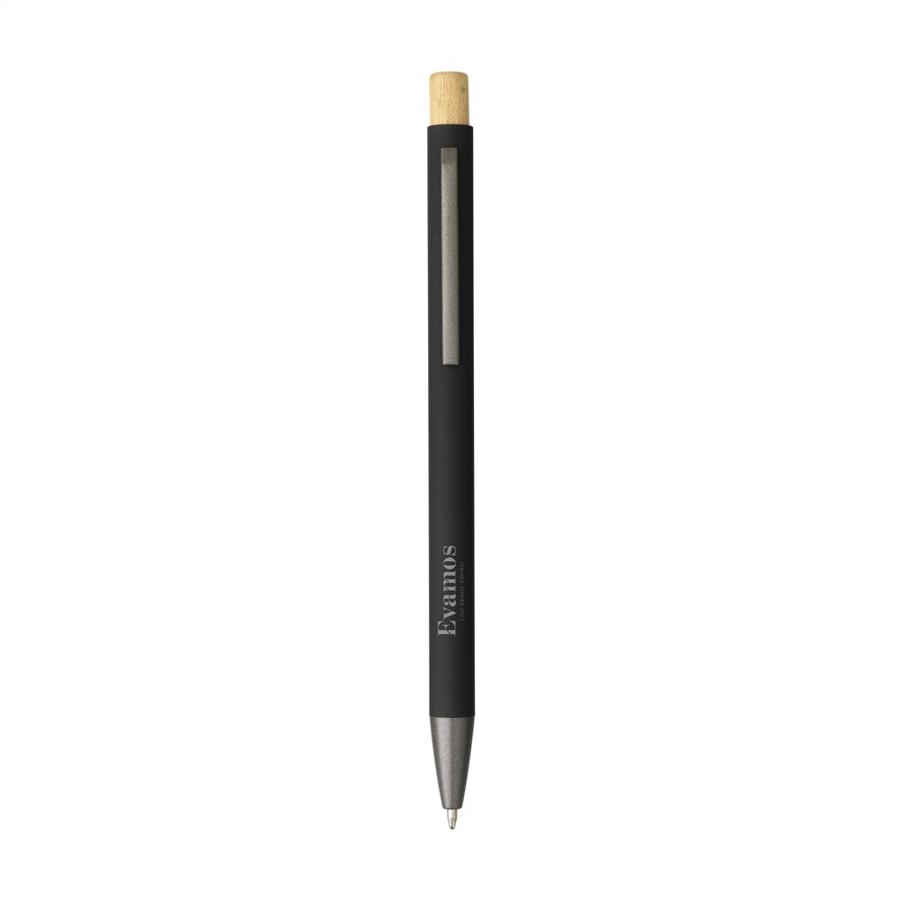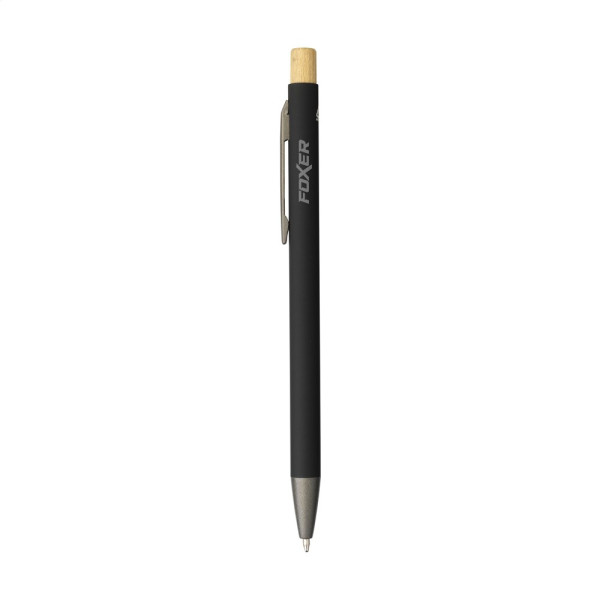 Blue ink, slim ballpoint pen with barrel made from 100% recycled aluminium with a rubberised finish. Metal clip. Sleek design. The bamboo push button gives the pen a natural touch. GRS-certified. The use of recycled aluminium means that fewer new raw materials are used in production. This means less energy consumption and less use of water.